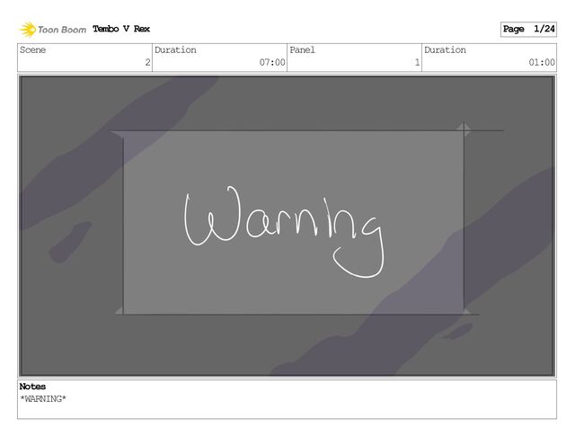 Scene 2 Duration 07:00 Panel 1 Duration 01:00 Notes *WARNING*