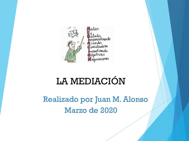 una tercera persona neutral (el mediador/a), sin poder sobre las partes ayuda a estas a alcanzar voluntariamente un acuerdo mutuamente aceptable. Está demostrado que es un instrumento que, bien llevado, mejora en las relaciones interpersonales y la gestión de sus conflictos