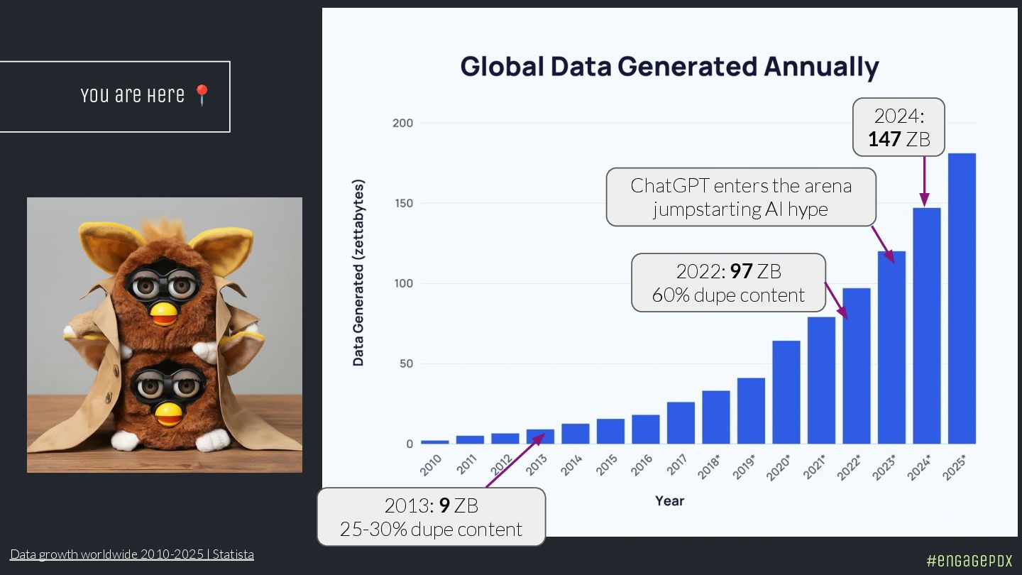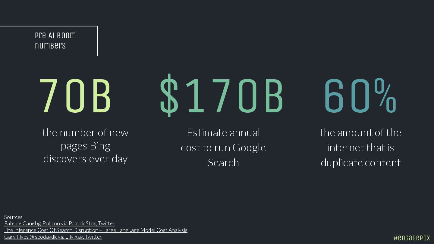 In 2022, Googler Gary Illyes said 60% of the internet is duplicate content. The next year, Bing discovered 70 billion new pages daily. That was before generative AI exploded. The latest studies estimate that 400 million terabytes of content are created daily.