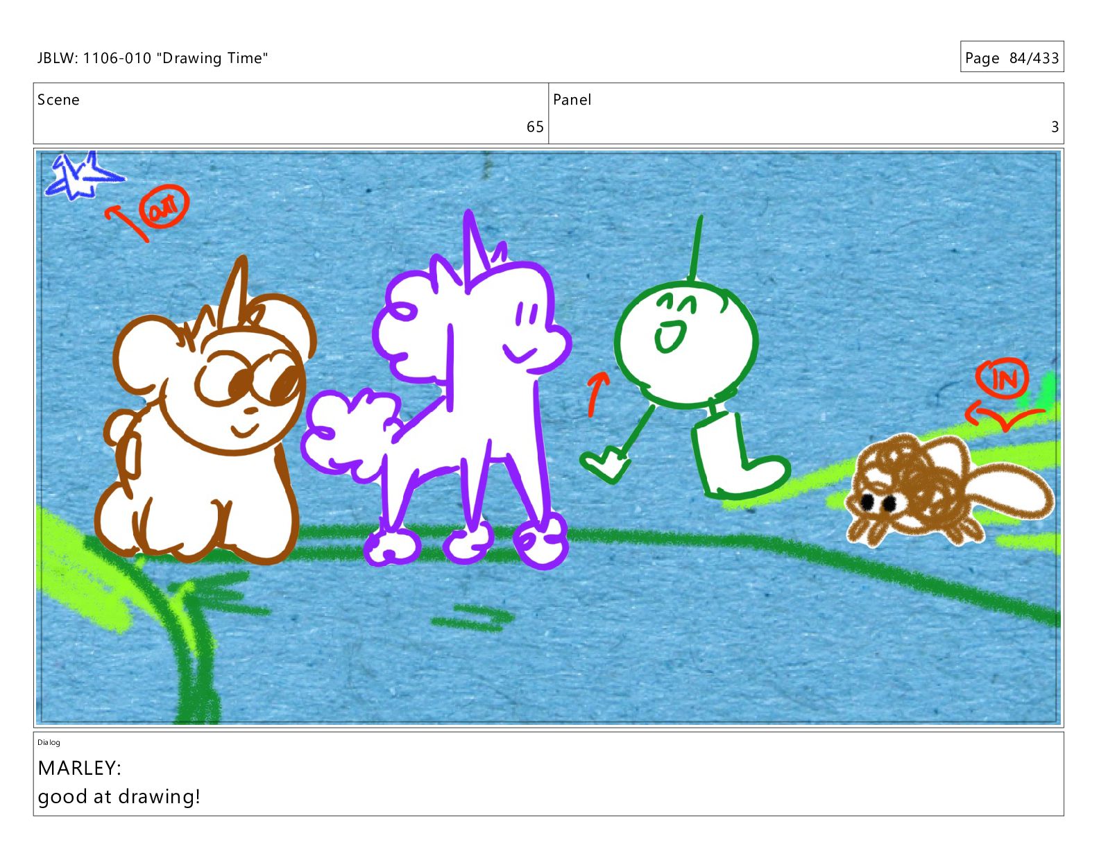 Scene 65 Panel 3 Dialog MARLEY: good at drawing! JBLW: