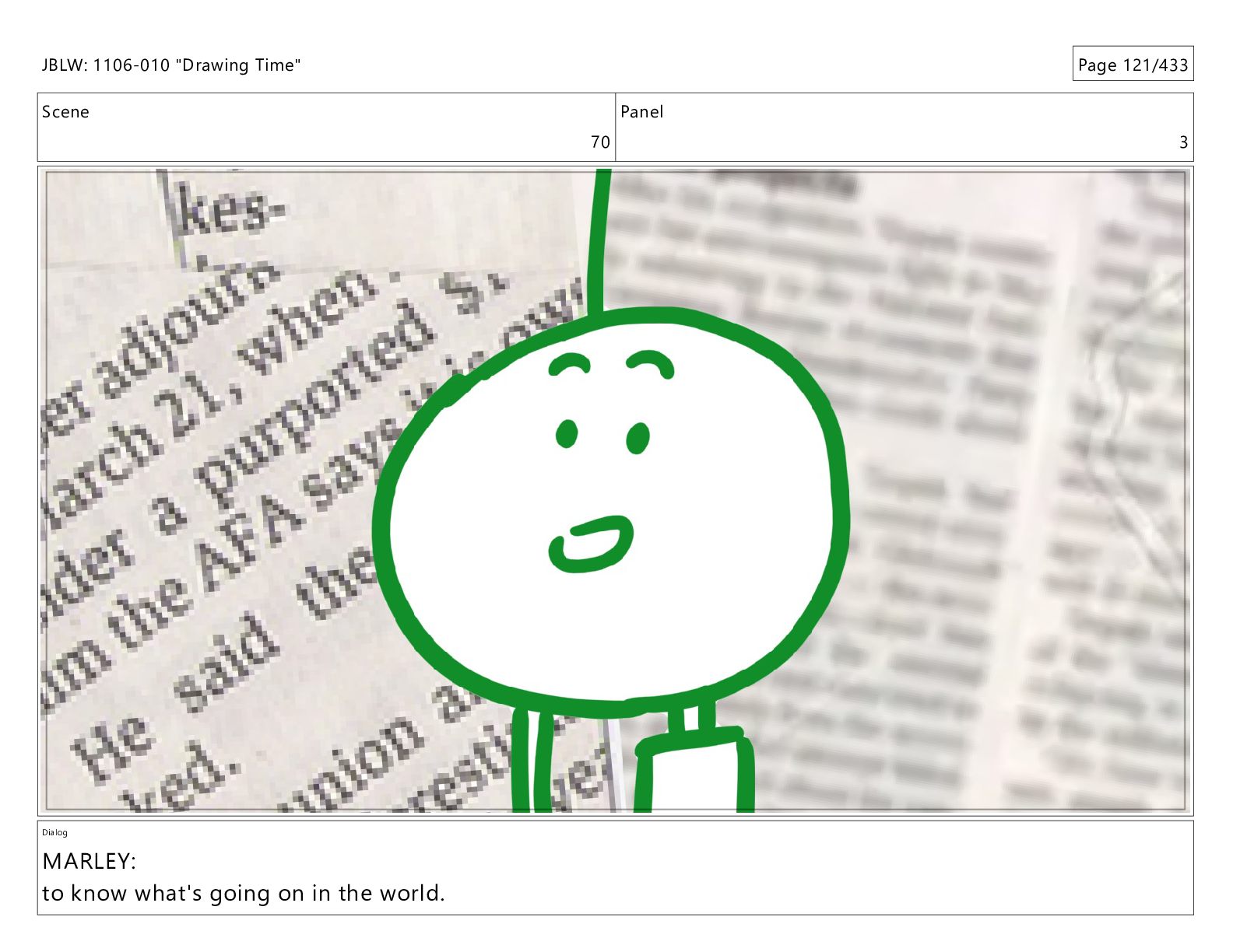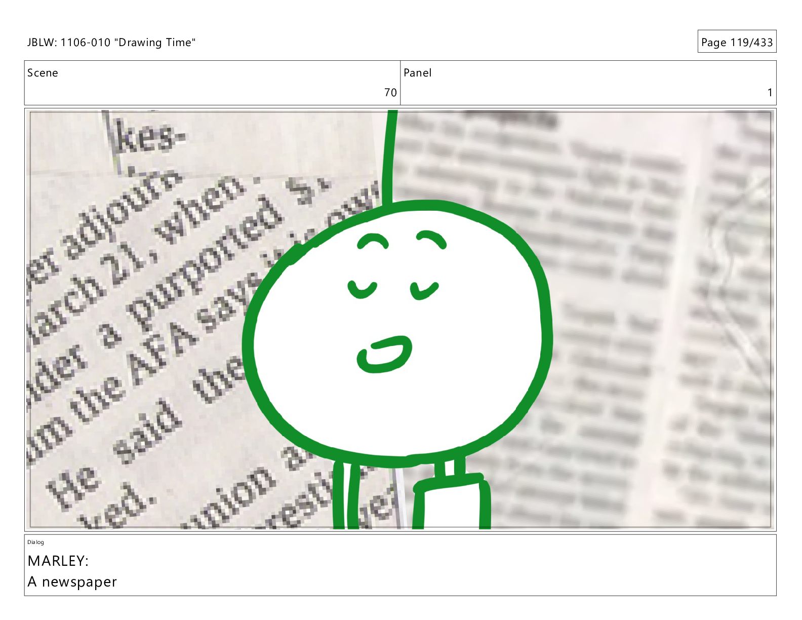 Scene 70 Panel 1 Dialog MARLEY: A newspaper JBLW: 1106-010