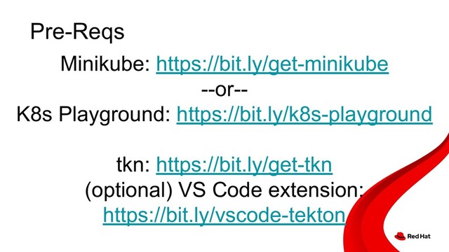 (optional) VS Code Tekton extension: https://marketplace.visualstudio.com/items?itemName=redhat.vscode-tekton-pipelines