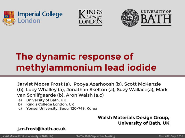 September Meeting Thurs 8th Sept 2016 a Baikie T., et al., Synthesis and crystal chemistry of the hybrid perovskite (CH 3 NH 3 ) PbI 3 for solid-state sensitised solar cell applications, J. Mater. Chem. A, 1, 5628-5641 (2013). b Stoumpos, C. C., Malliakas, C. D. & Kanatzidis, M. G. Semiconducting tin and lead iodide perovskites with organic cations: phase transitions, high mobilities, and near-infrared photoluminescent properties. Inorg. Chem. 52, 9019–9038 (2013). c Weller M. T., et al., Complete structure and cation orientation in the perovskite photovoltaic methylammonium lead iodide between 100 and 352K Chem. Comm., DOI:10.1039/c4cc09944c (2015) d Kawamura Y., Mashiyama H., Hasebe K., Structural study on cubic-tetragonal transition of CH 3 NH 3 PbI 3 , J. Phys. Soc. Japan. 71, 1694-1697 (2002). † Note: due to the manner in which orientational disorder is fitted to neutron diffraction data, this bond length represents an underestimate. To refine the orthorhombic structure, Weller et al use fixed bond lengths of 1.46Å (C-N), 1.13Å (C-H) and 1.00Å (N-H).