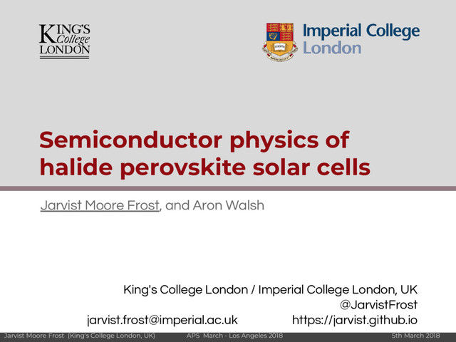 1. “Atomistic origins of high-performance in halide perovskite solar cells” Nano Letters, 14, 2584 (2014)