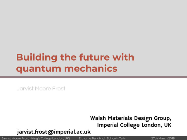 School - Talk 27th March 2018 Walsh Materials Design Group, Imperial College London, UK [email protected] Building the future with quantum mechanics Jarvist Moore Frost