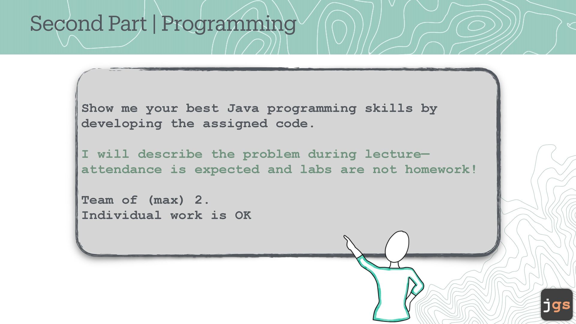 skills by developing the assigned code. I will describe the problem during lecture— attendance is expected and labs are not homework! Team of (max) 2. Individual work is OK