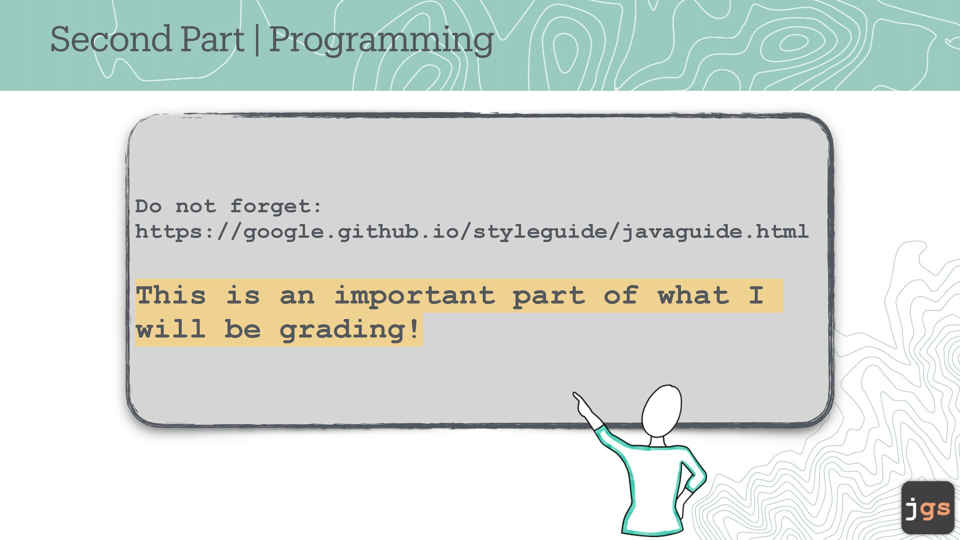form a tting guidelines. https://google.github.io/styleguide/javaguide.html • Use indent a tion, whitesp a ce, a nd comments e ff ectively to enh a nce re a d a bility. 17