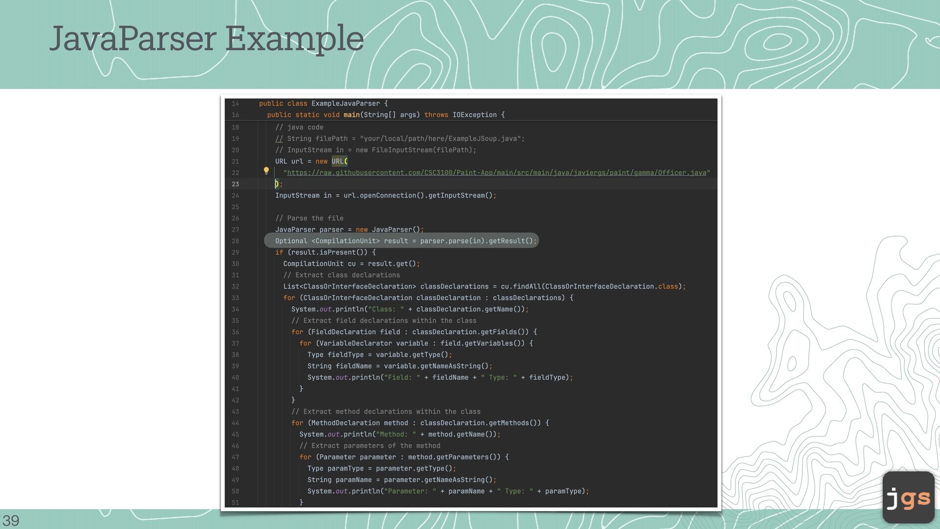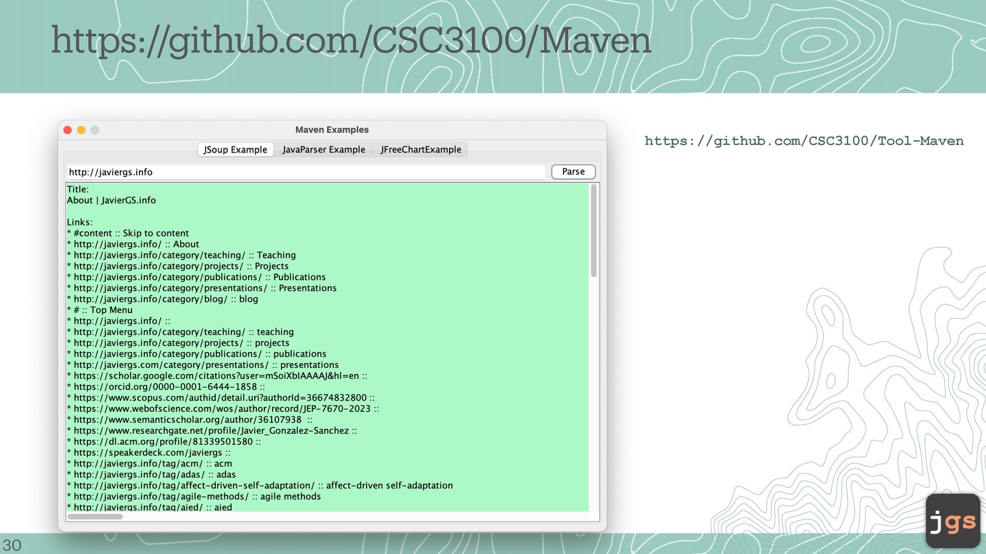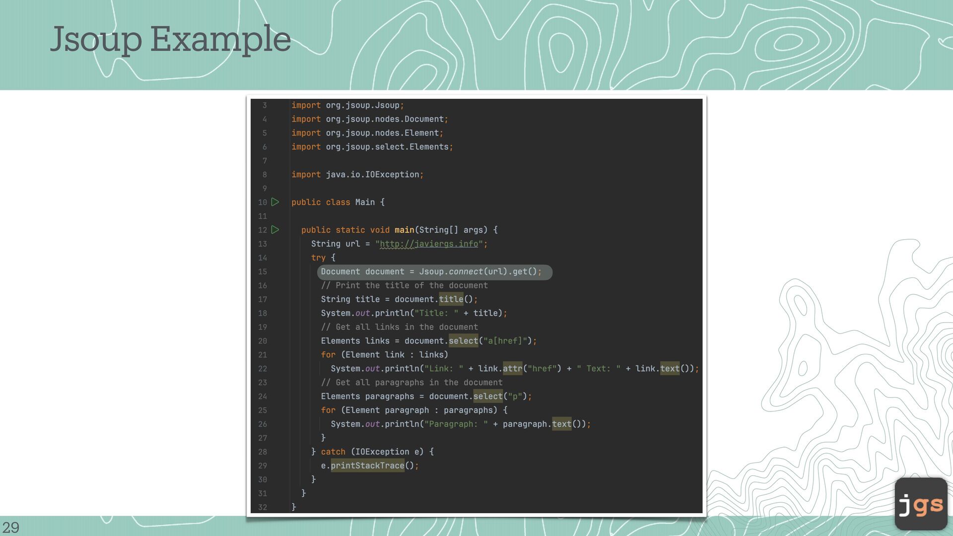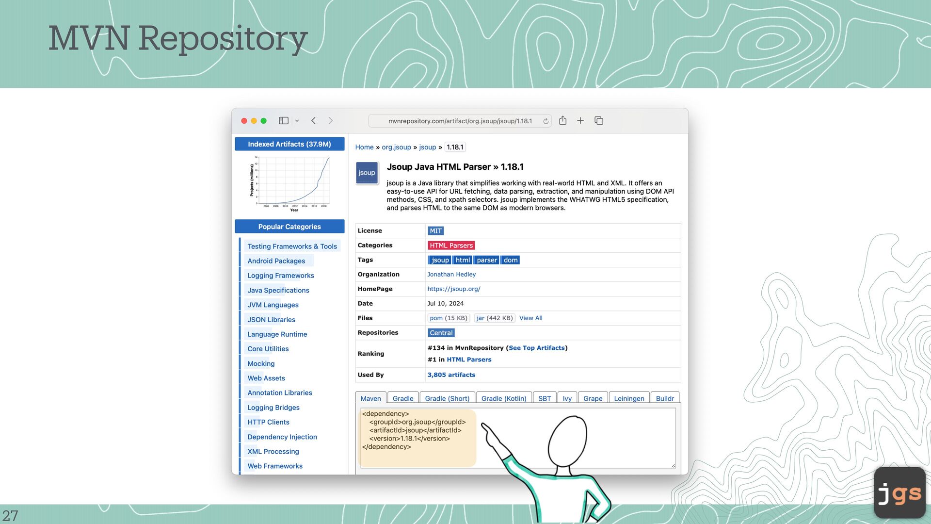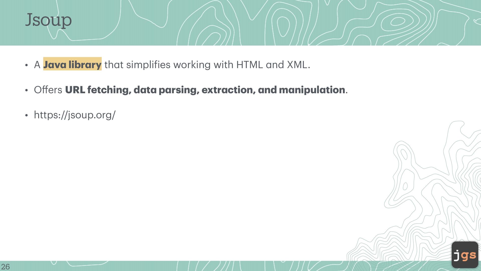th a t simpli f ies working with HTML a nd XML. • O ff ers URL fetching, d a t a p a rsing, extr a ction, a nd m a nipul a tion. • https://jsoup.org/ 26