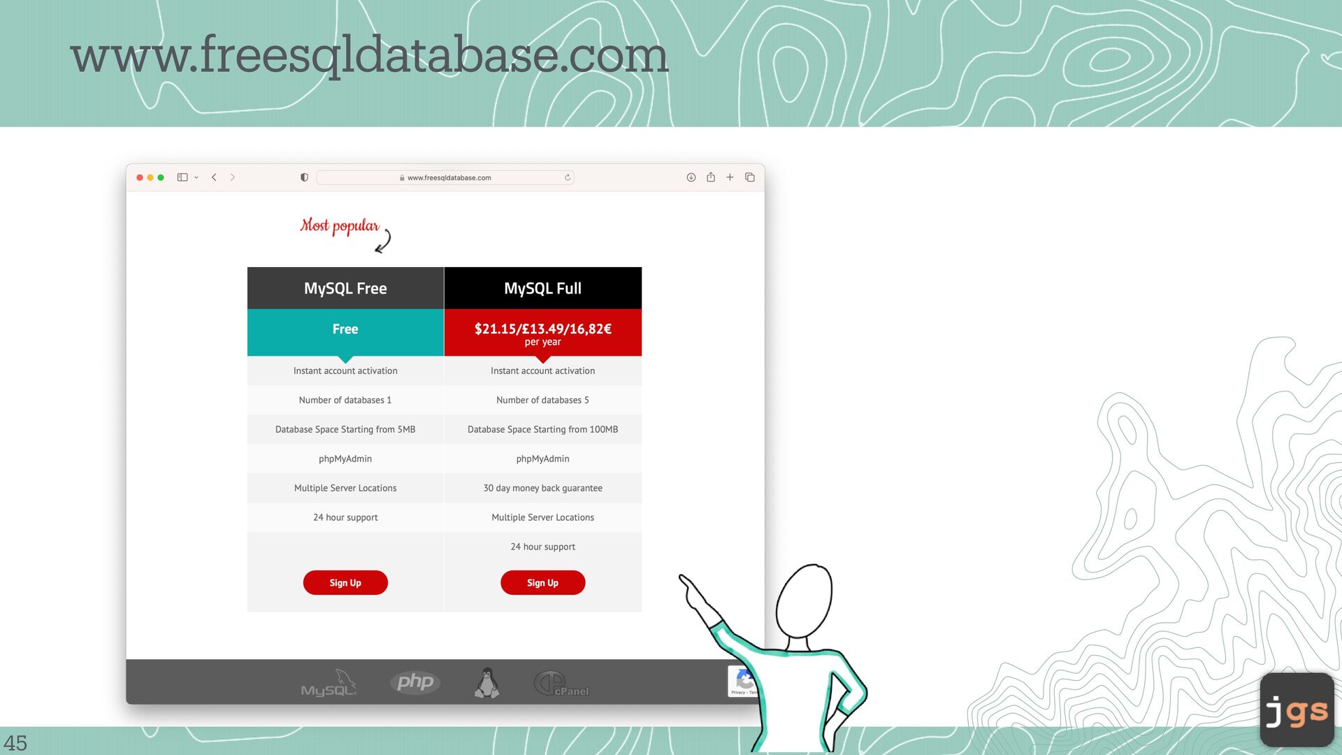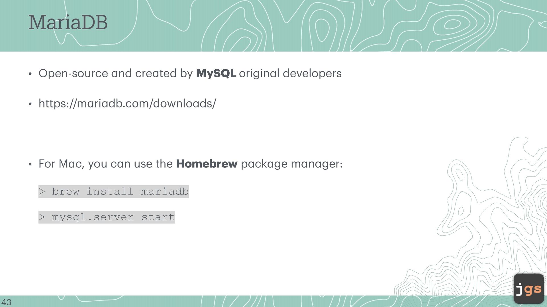 origin a l developers • https://m a ri a db.com/downlo a ds/ • For M a c, you c a n use the Homebrew p a ck a ge m a n a ger: > brew install mariadb > mysql.server start 43