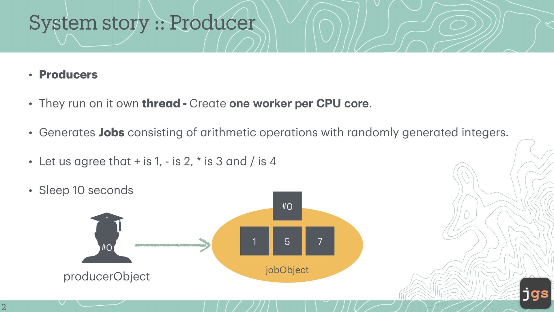 d - Cre a te one worker per CPU core. • Gener a tes Jobs consisting of a rithmetic oper a tions with r a ndomly gener a ted integers. • Let us a gree th a t + is 1, - is 2, * is 3 a nd / is 4 • Sleep 10 seconds jobObject System story :: Producer 2 1 5 7 #0 producerObject #0