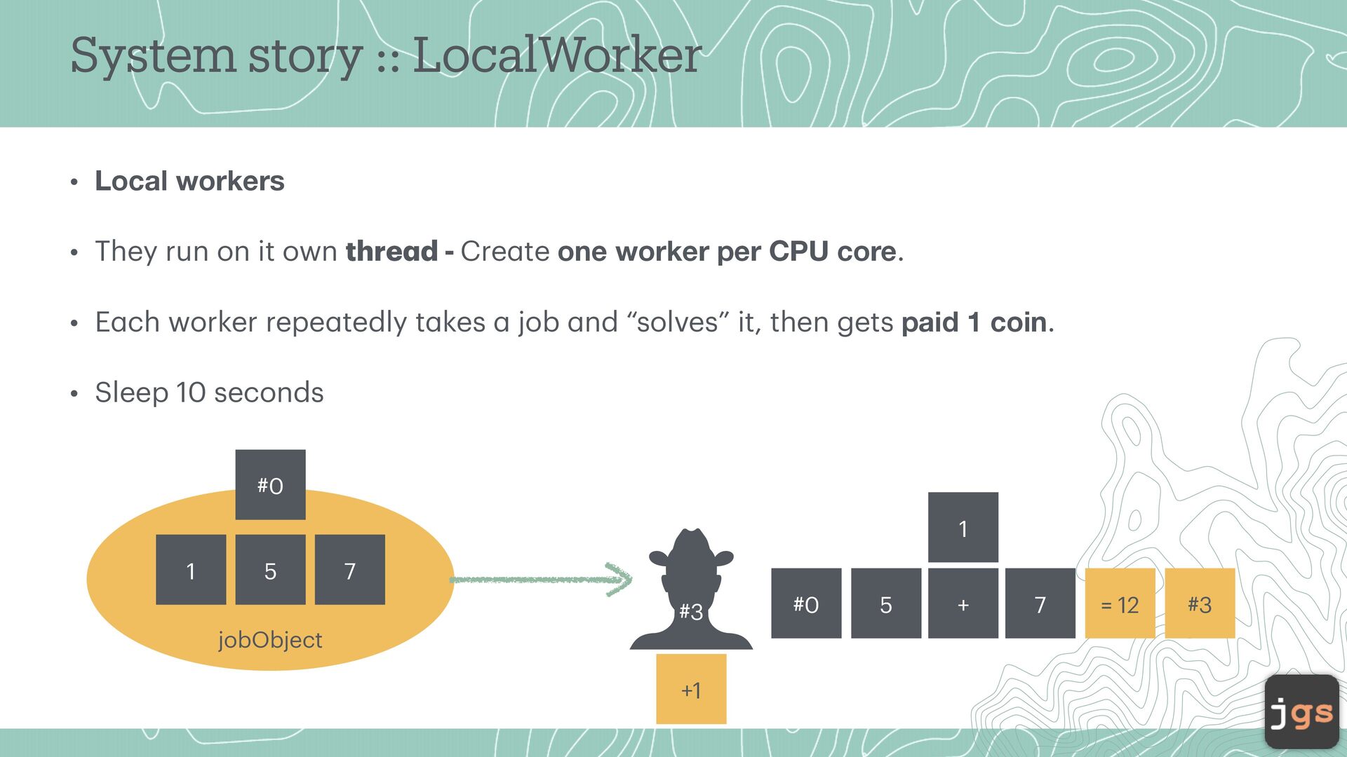 a d - Cre a te one worker per CPU core. • E a ch worker repe a tedly t a kes a job a nd “solves” it, then gets paid 1 coin. • Sleep 10 seconds System story :: LocalWorker + 5 7 #3 #0 #3 1 jobObject 1 5 7 #0 = 12 +1