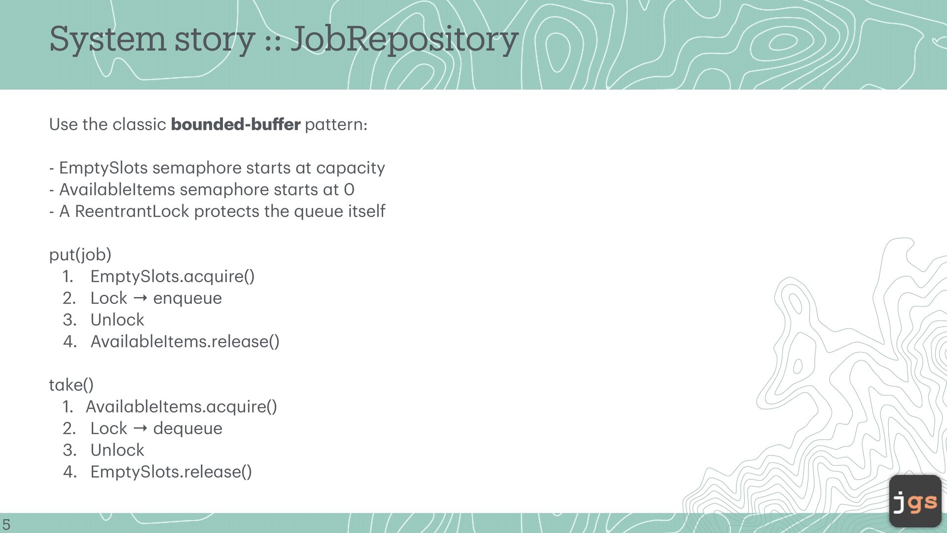 job bu ff er of size NCPU, protected with Semaphores a nd a ReentrantLock. System story :: JobRepository