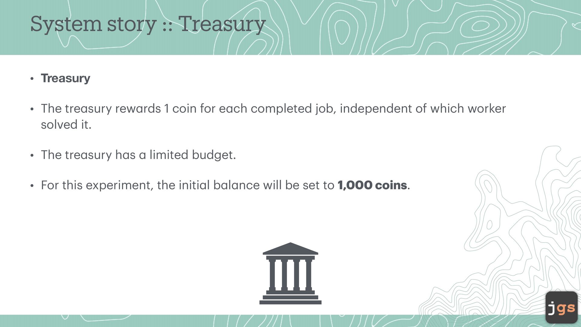1 coin for e a ch completed job, independent of which worker solved it. • The tre a sury h a s a limited budget. • For this experiment, the initi a l b a l a nce will be set to 1,000 coins. System story :: Treasury