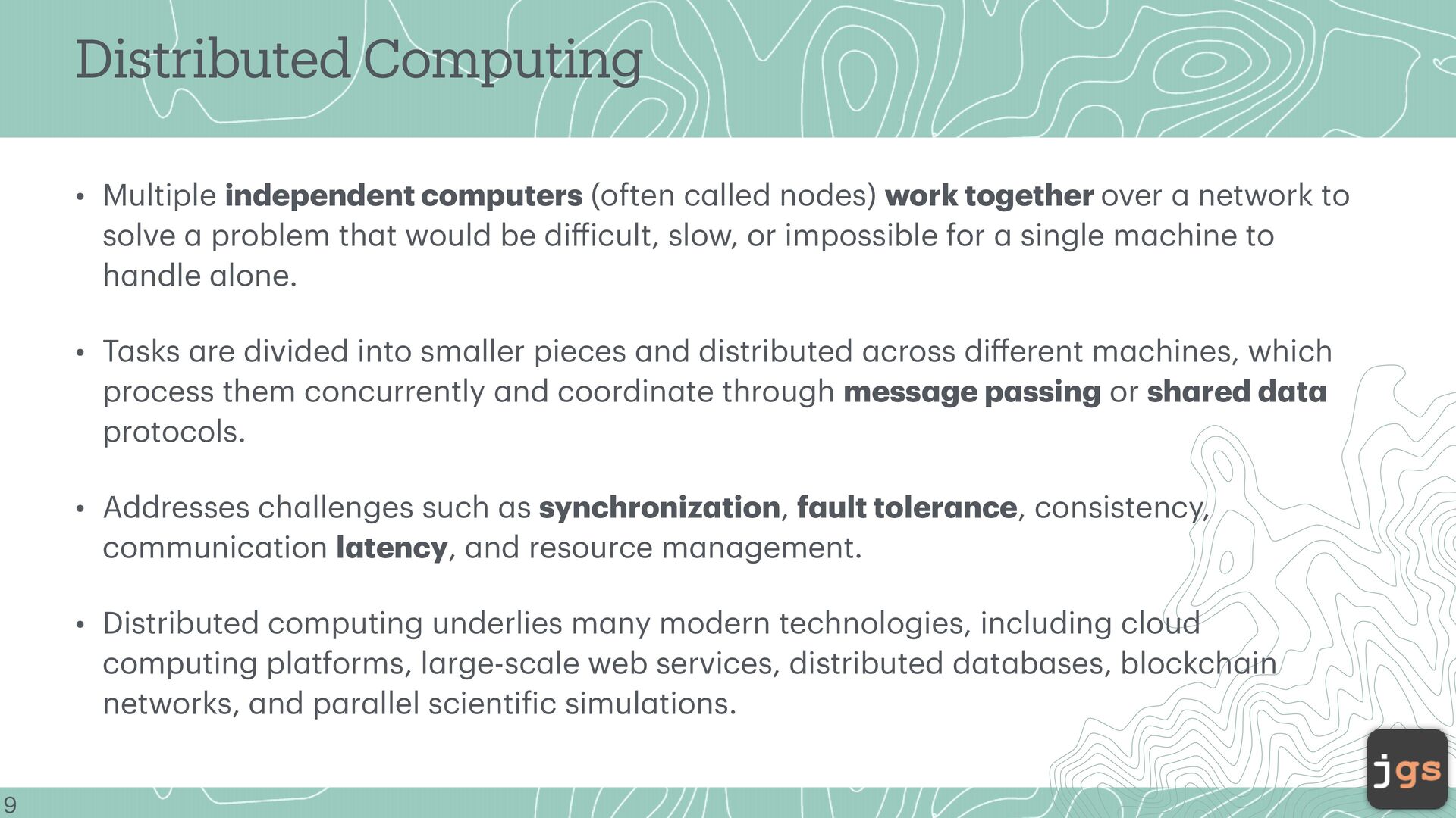 nodes) work together over a network to solve a problem th a t would be di ff icult, slow, or impossible for a single m a chine to h a ndle a lone. • T a sks a re divided into sm a ller pieces a nd distributed a cross di ff erent m a chines, which process them concurrently a nd coordin a te through mess a ge p a ssing or sh a red d a t a protocols. • Addresses ch a llenges such a s synchroniz a tion, f a ult toler a nce, consistency, communic a tion l a tency, a nd resource m a n a gement. • Distributed computing underlies m a ny modern technologies, including cloud computing pl a tforms, l a rge-sc a le web services, distributed d a t a b a ses, blockch a in networks, a nd p a r a llel scienti f ic simul a tions. 9