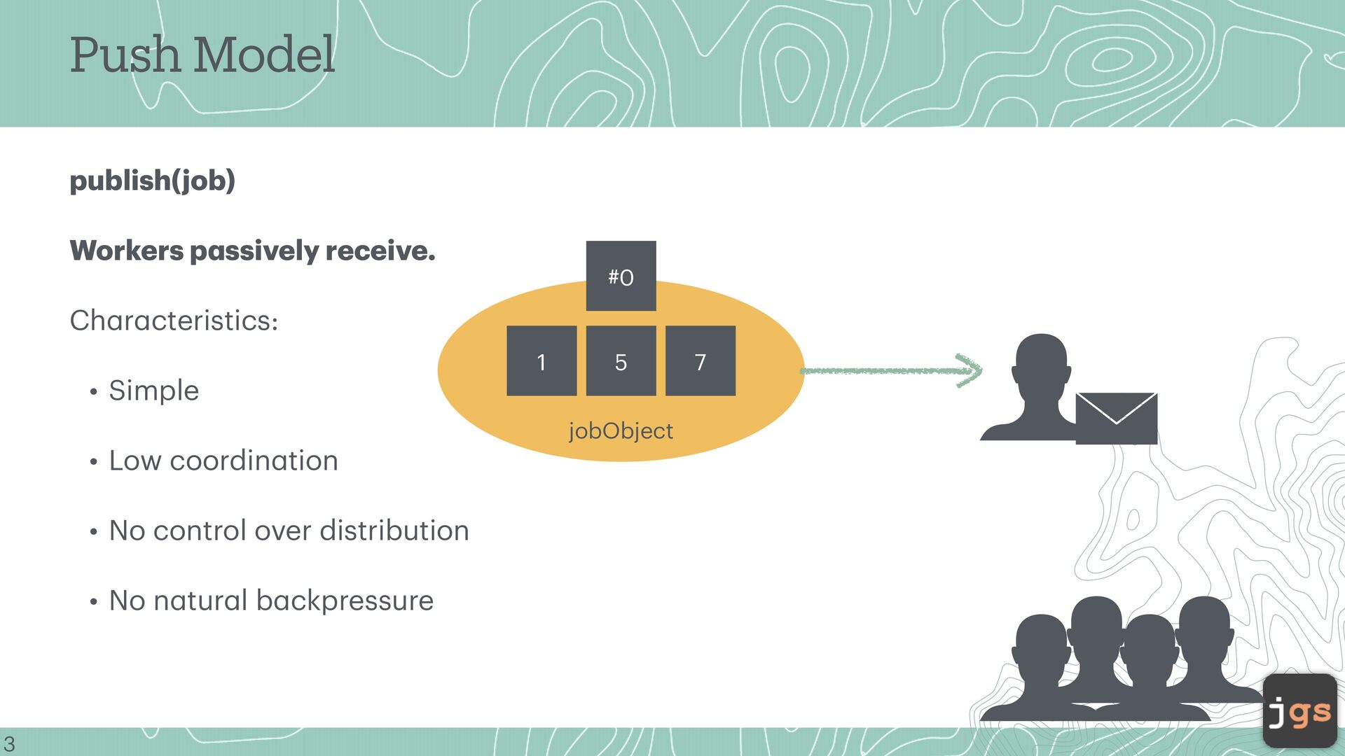 r a cteristics: • Simple • Low coordin a tion • No control over distribution • No n a tur a l b a ckpressure 3 jobObject 1 5 7 #0