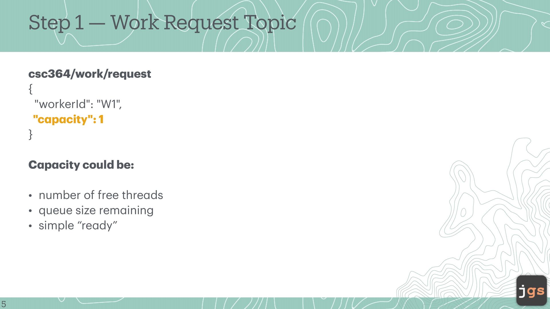 4. Step 1 — Work Request Topic csc364/work/request { "workerId": "W1",