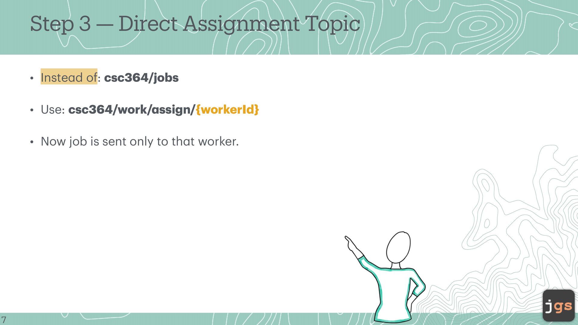 of: csc364/jobs • Use: csc364/work/ a ssign/{workerId} • Now job is sent only to th a t worker. 7
