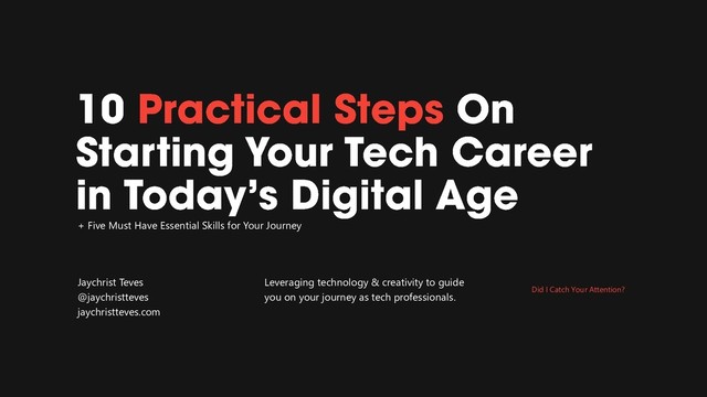 10 Practical Steps On Starting Your Tech Career in Today's Digital Age 10 Practical Steps On Starting Your Tech Career in Today's Digital Age + Five Must Have Essential Skills for Your Journey