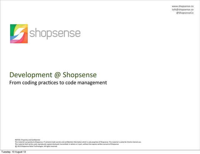 IT  contains  trade  secrets  and  confiden5al  informa5on  which  is  sole  propriety  of  Shopsense.  This  material  is  solely  for  Clients  internal  use. This  material  shall  not  be  used,  reproduced,  copied,  disclosed,  transmiBed,  in  whole  or  in  part,  without  the  express  wriBen  consent  of  Shopsense            2013  Shopsense  Retail  Technologies.  All  rights  reserved. www.shopsense.co [email protected] @ShopsenseCo © Development  @  Shopsense From  coding  prac5ces  to  code  management Tuesday, 13 August 13