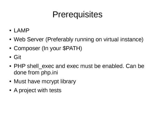 instance) • Composer (In your $PATH) • Git • PHP shell_exec and exec must be enabled. Can be done from php.ini • Must have mcrypt library • A project with tests