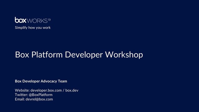 Developer training workshop presented at BoxWorks 2019. Topics of the presentation include: