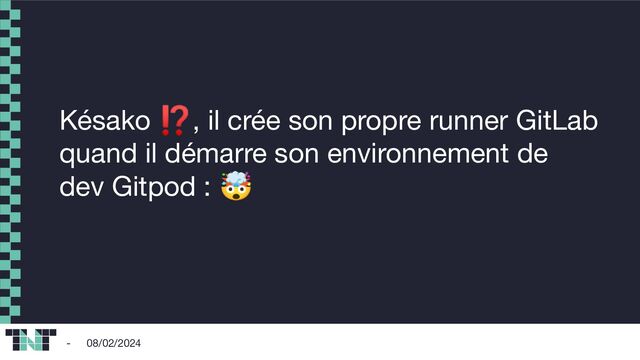 Dans ce talk après vous avoir présenté rapidement ce qu’est un runner, je vous montrerai comment j’ai configuré mon projet pour avoir mon propre runner GitLab créé et configuré au démarrage de mon workspace Gitpod 🤘