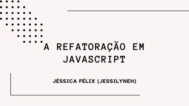 anos. Trabalho na área faz 6 anos. Estou focada em JavaScript e Front-end. Estou I .T. Architect II na F1rst (Grupo Santander) Estou Tech Lead na ONG Lacrei Saúde Estou Instrutora de Javascript na Linux Tips REFATORAÇÃO EM JAVASCRIPT @jessilyneh