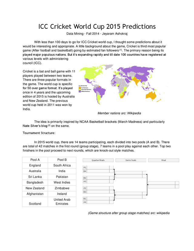 2014 - Jeyaram Ashokraj With less than 100 days to go for ICC Cricket world cup, I thought some predictions about it would be interesting and appropriate. A little background about the game, Cricket is third most popular game (After football and basketball) going by estimated fan followers [1]. The primary reason being its played major populous nations. But it’s expanding rapidly and till date 106 countries have registered at various levels with administering council (ICC). Cricket is a bat and ball game with 11 players played between two teams. There are three popular formats in the game. The world cup is specific for 50 over game format. It’s played once in 4 years and the upcoming edition of 2015 is hosted by Australia and New Zealand. The previous world cup held in 2011 was won by India. Member nations src: Wikipedia The idea is primarily inspired by NCAA Basketball brackets (March Madness) and particularly Nate Silver’s blog [2] on the same. Tournament Structure: In 2015 world cup, there are 14 teams participating, each divided into two pools (A and B). There are total of 42 matches in the first round (group stage), 7 teams in a pool play against each other. Top two finishers in the pool proceed to next rounds, which are knock-out style matches. Pool A Pool B England South Africa Australia India Sri Lanka Pakistan Bangladesh West Indies New Zealand Zimbabwe Afghanistan Ireland Scotland United Arab Emirates (Game structure after group stage matches) src: wikipedia