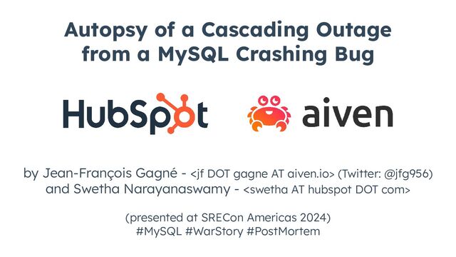 Once upon a time, an application query triggered a crashing bug. After automated failure recovery, the application resented the query, and MySQL crashed again. This was the beginning of a cascading failure that led to a full datastore unavailability and some partial data loss.
