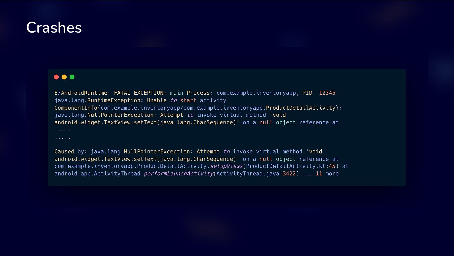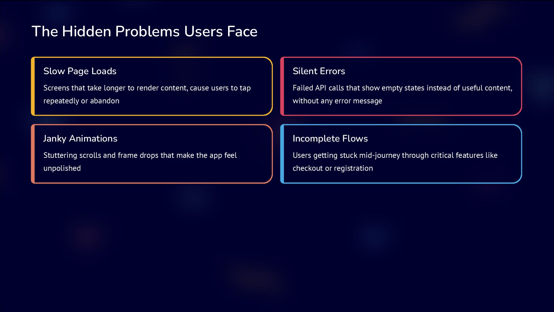 take longer to render content, cause users to tap repeatedly or abandon Silent Errors Failed API calls that show empty states instead of useful content, without any error message Janky Animations Stuttering scrolls and frame drops that make the app feel unpolished Incomplete Flows Users getting stuck mid-journey through critical features like checkout or registration