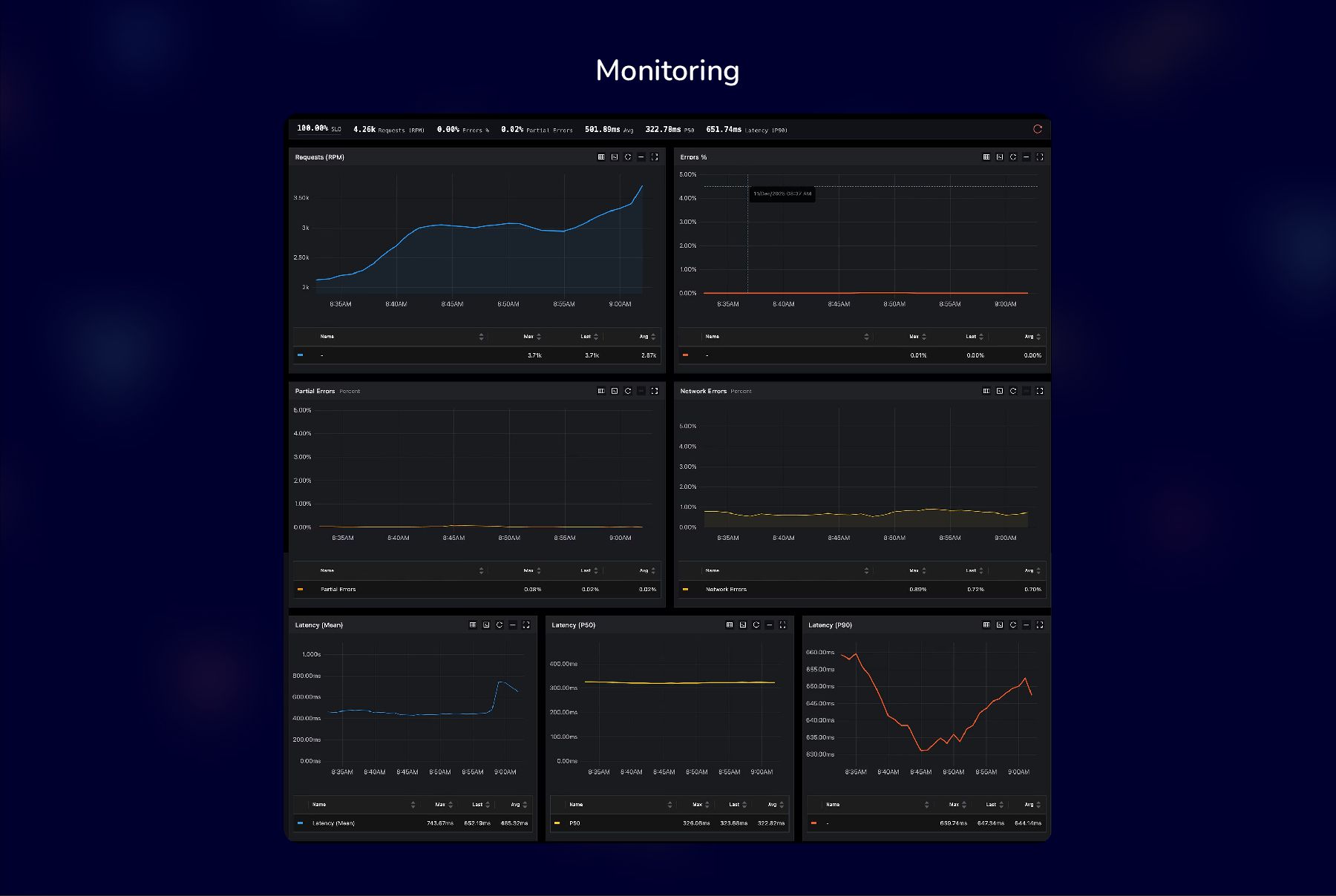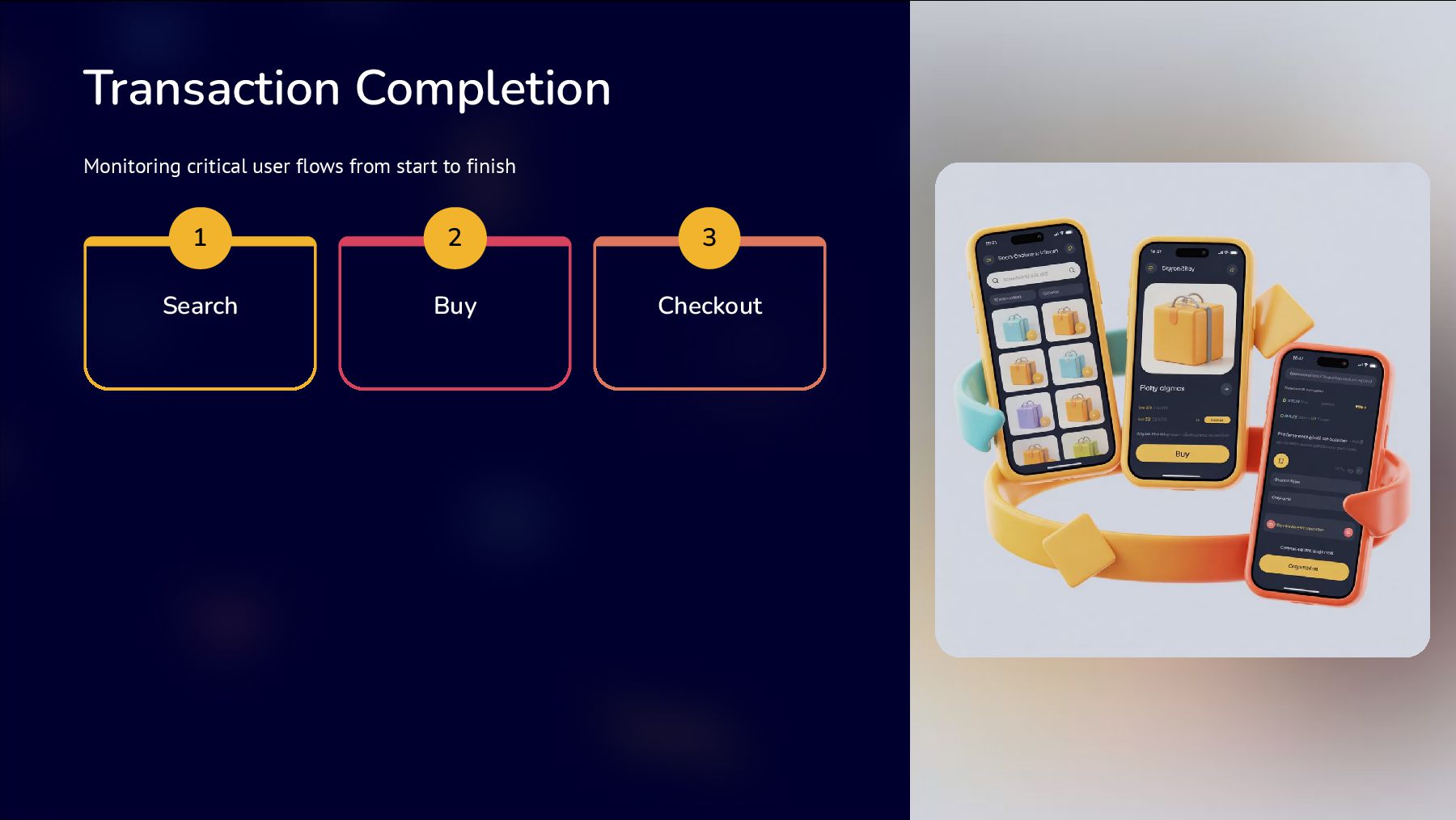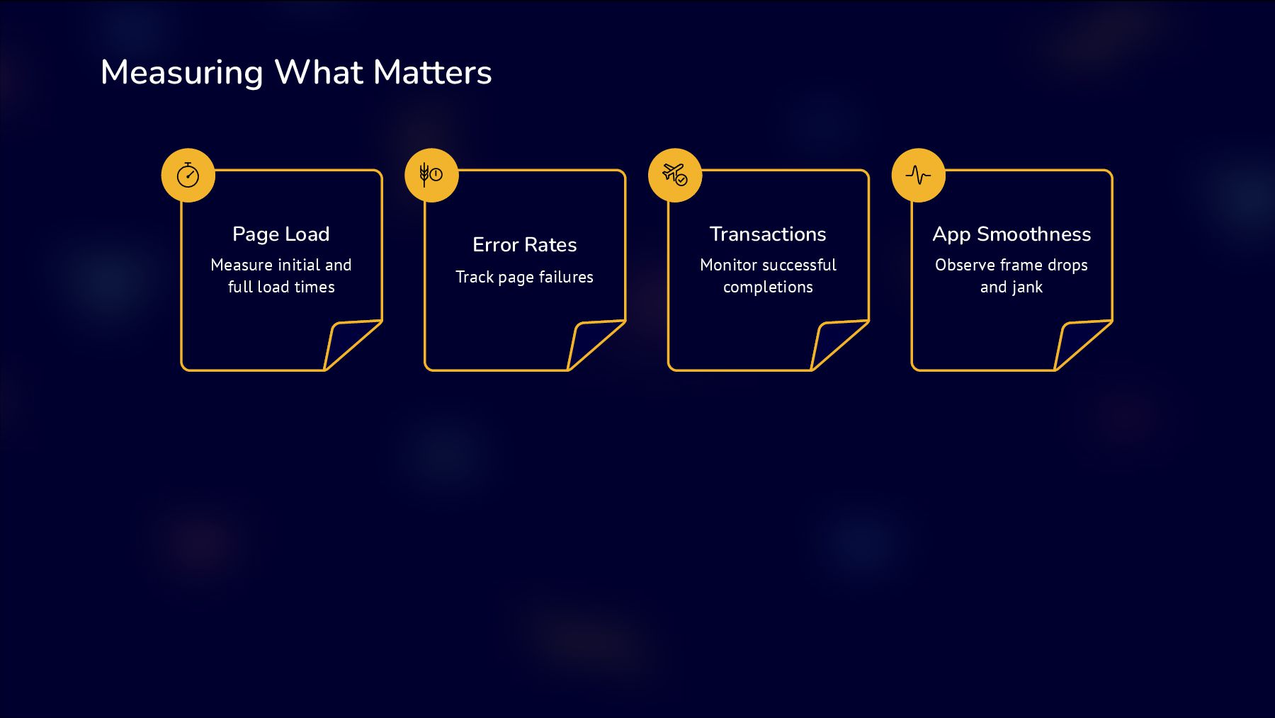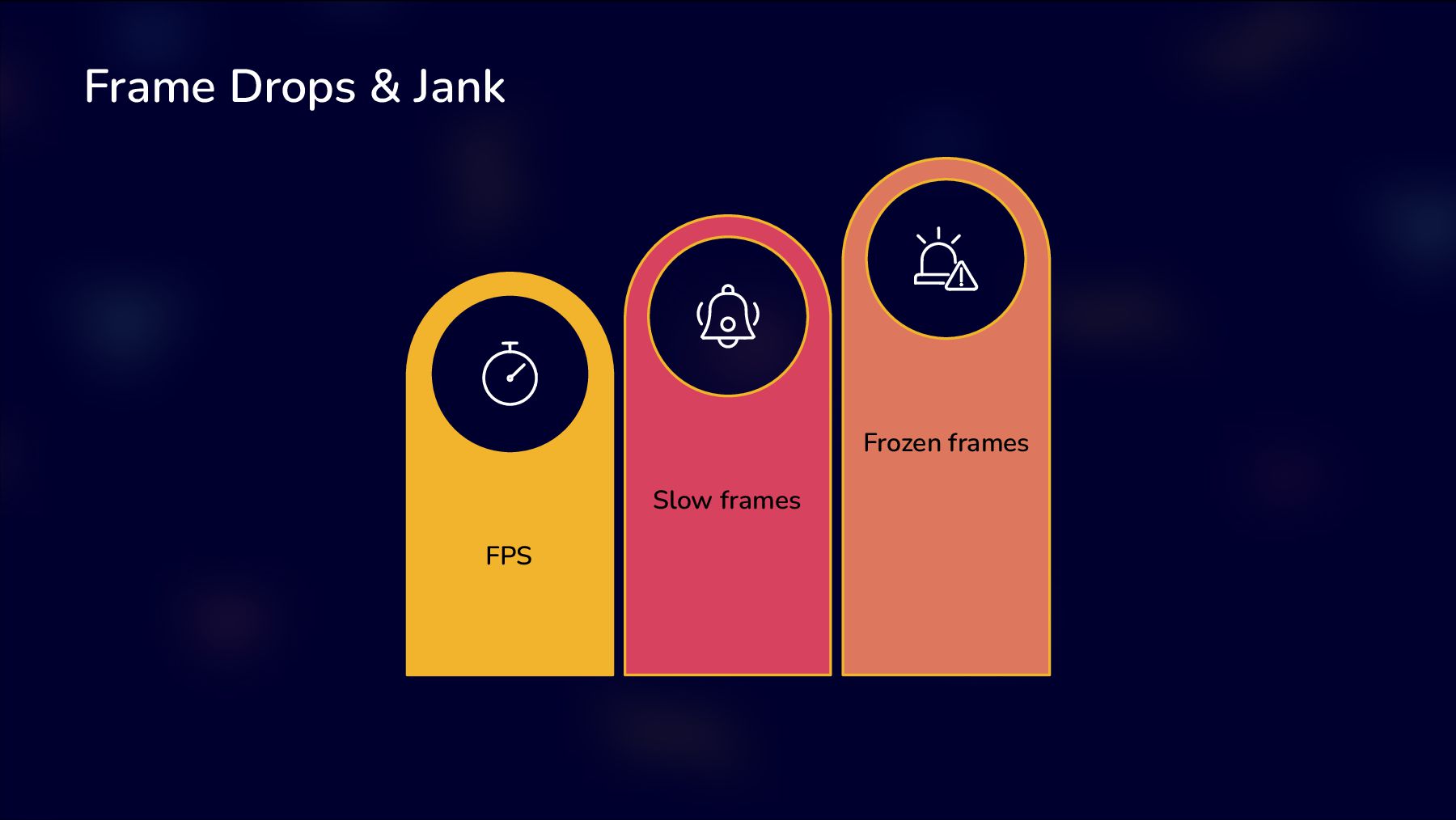 times Error Rates Track page failures Transactions Monitor successful completions App Smoothness Observe frame drops and jank