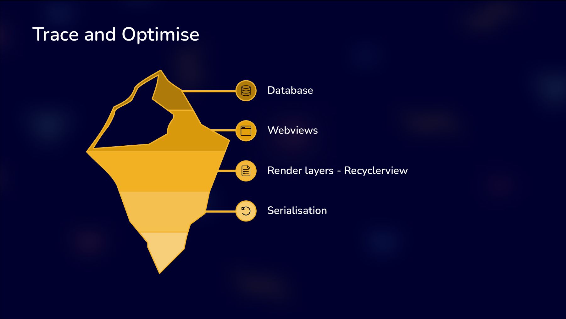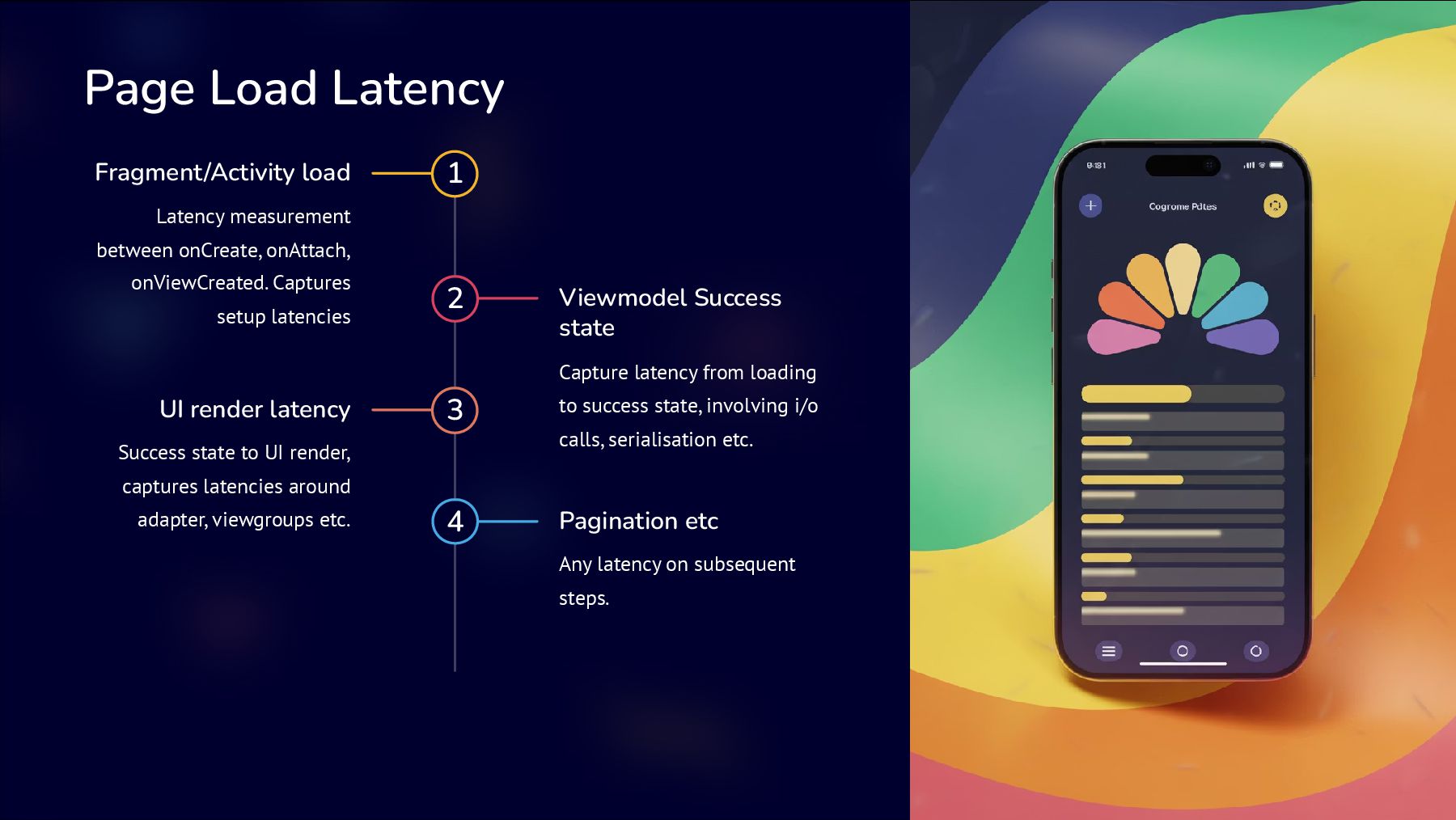 onAttach, onViewCreated. Captures setup latencies 2 Viewmodel Success state Capture latency from loading to success state, involving i/o calls, serialisation etc. 3 UI render latency Success state to UI render, captures latencies around adapter, viewgroups etc. 4 Pagination etc Any latency on subsequent steps.