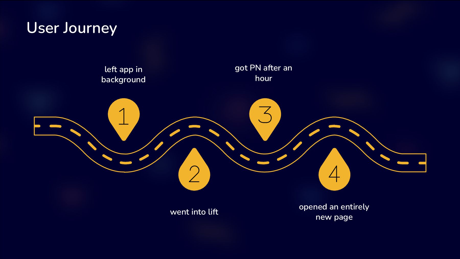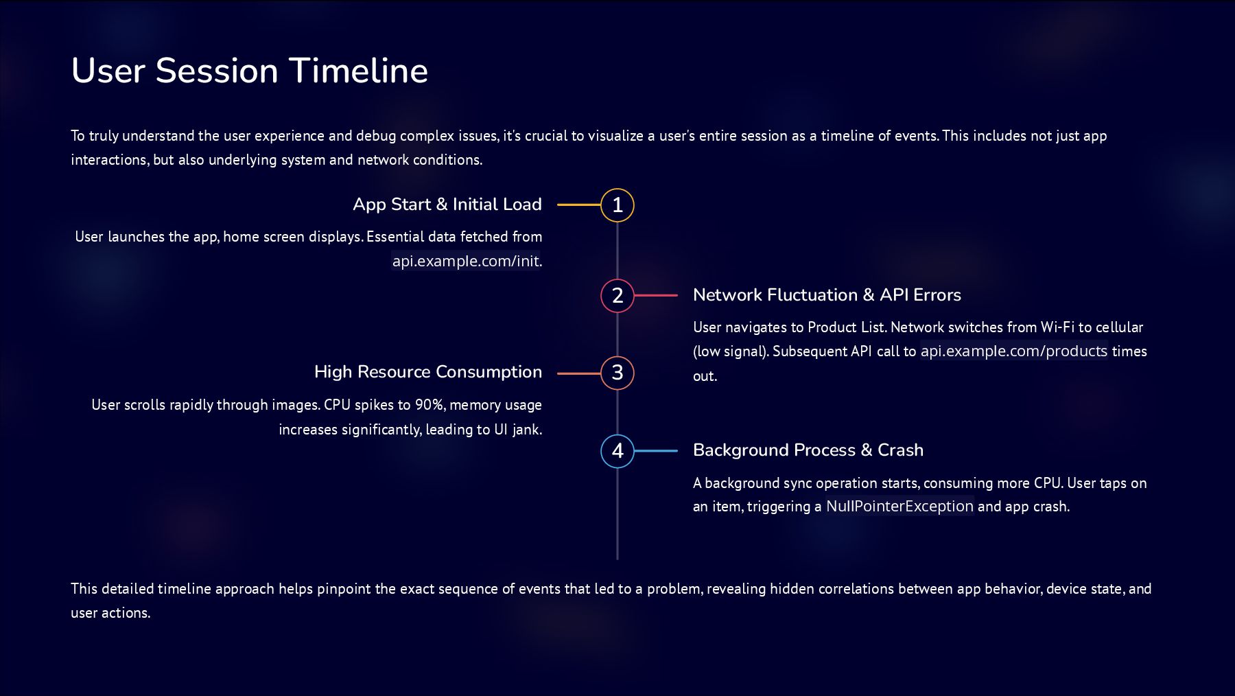 debug complex issues, it's crucial to visualize a user's entire session as a timeline of events. This includes not just app interactions, but also underlying system and network conditions. 1 App Start & Initial Load User launches the app, home screen displays. Essential data fetched from api.example.com/init. 2 Network Fluctuation & API Errors User navigates to Product List. Network switches from Wi-Fi to cellular (low signal). Subsequent API call to api.example.com/products times out. 3 High Resource Consumption User scrolls rapidly through images. CPU spikes to 90%, memory usage increases significantly, leading to UI jank. 4 Background Process & Crash A background sync operation starts, consuming more CPU. User taps on an item, triggering a NullPointerException and app crash. This detailed timeline approach helps pinpoint the exact sequence of events that led to a problem, revealing hidden correlations between app behavior, device state, and user actions.