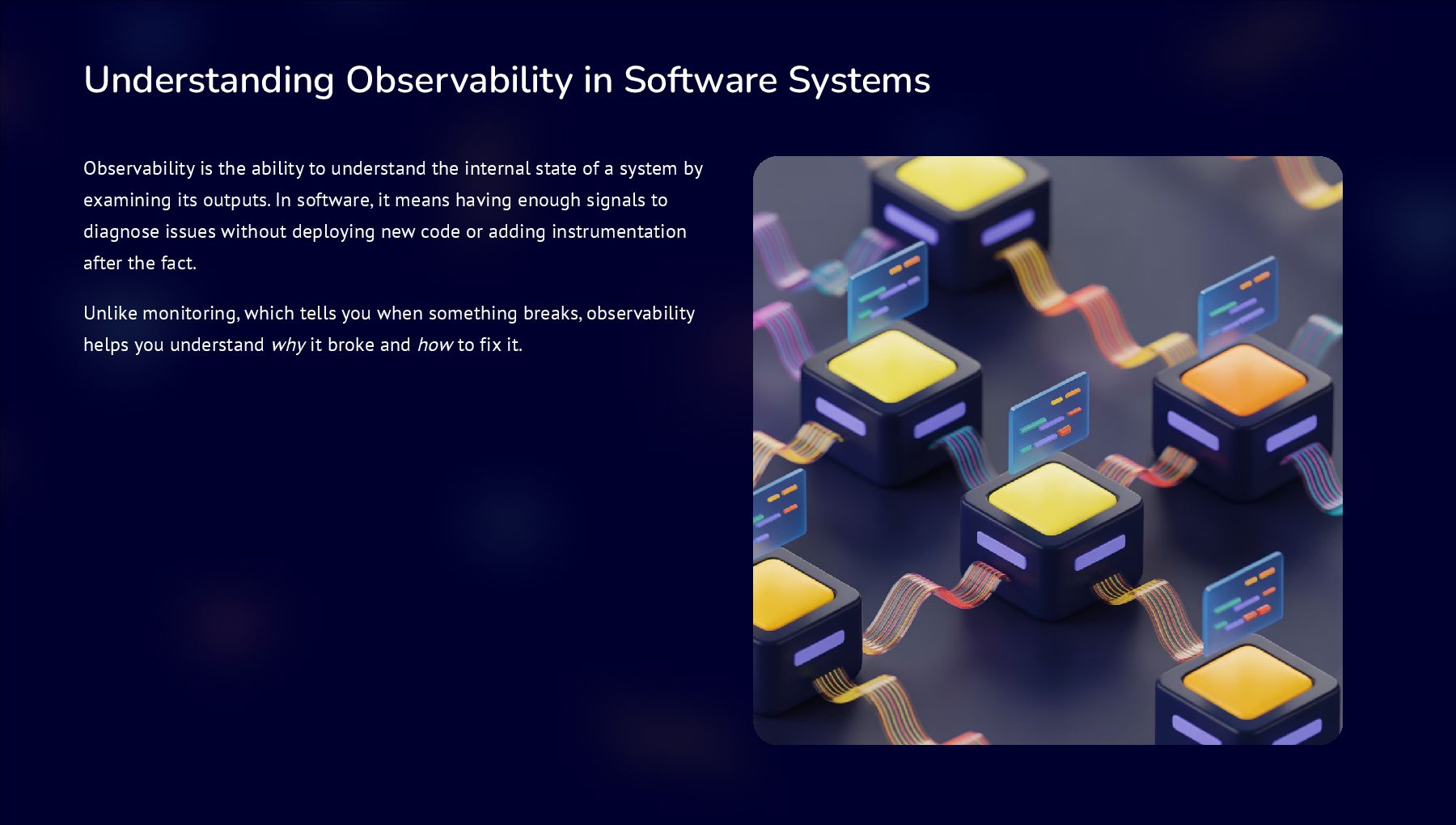 understand the internal state of a system by examining its outputs. In software, it means having enough signals to diagnose issues without deploying new code or adding instrumentation after the fact. Unlike monitoring, which tells you when something breaks, observability helps you understand why it broke and how to fix it.