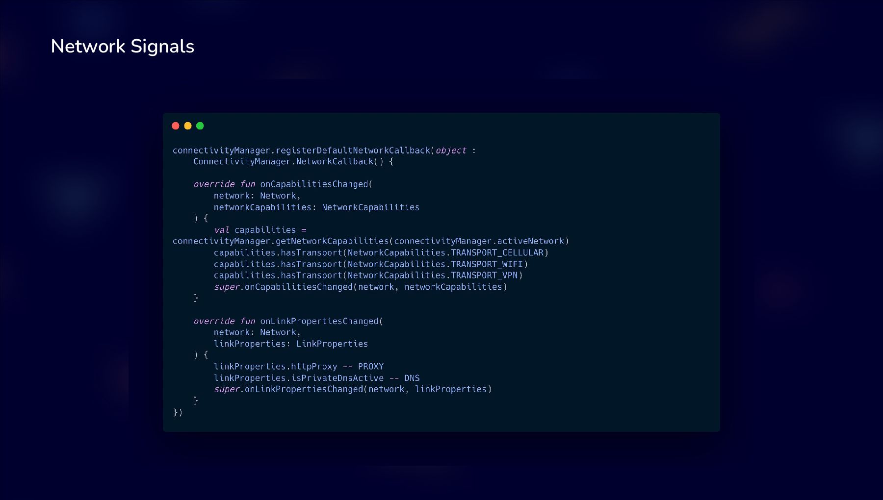 app performance, yet they're often overlooked. Network Type WiFi, 4G, 5G, 3G—each behaves differently Signal Strength Weak signals cause retries and timeouts Network Changes Transitions between networks disrupt connections