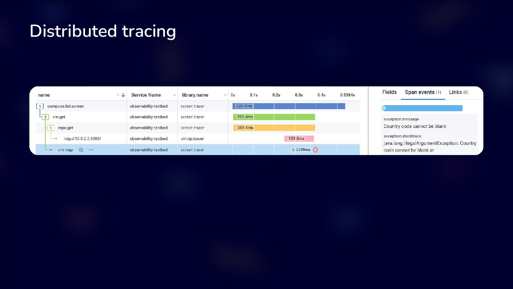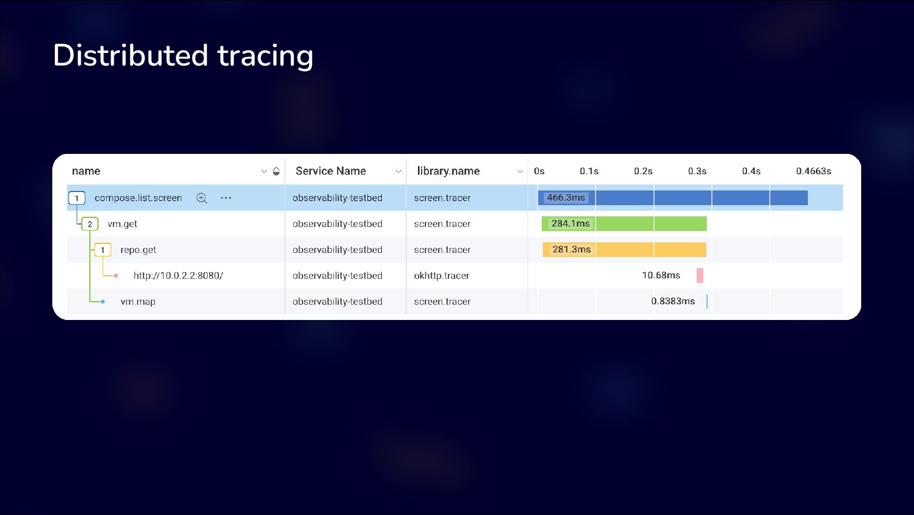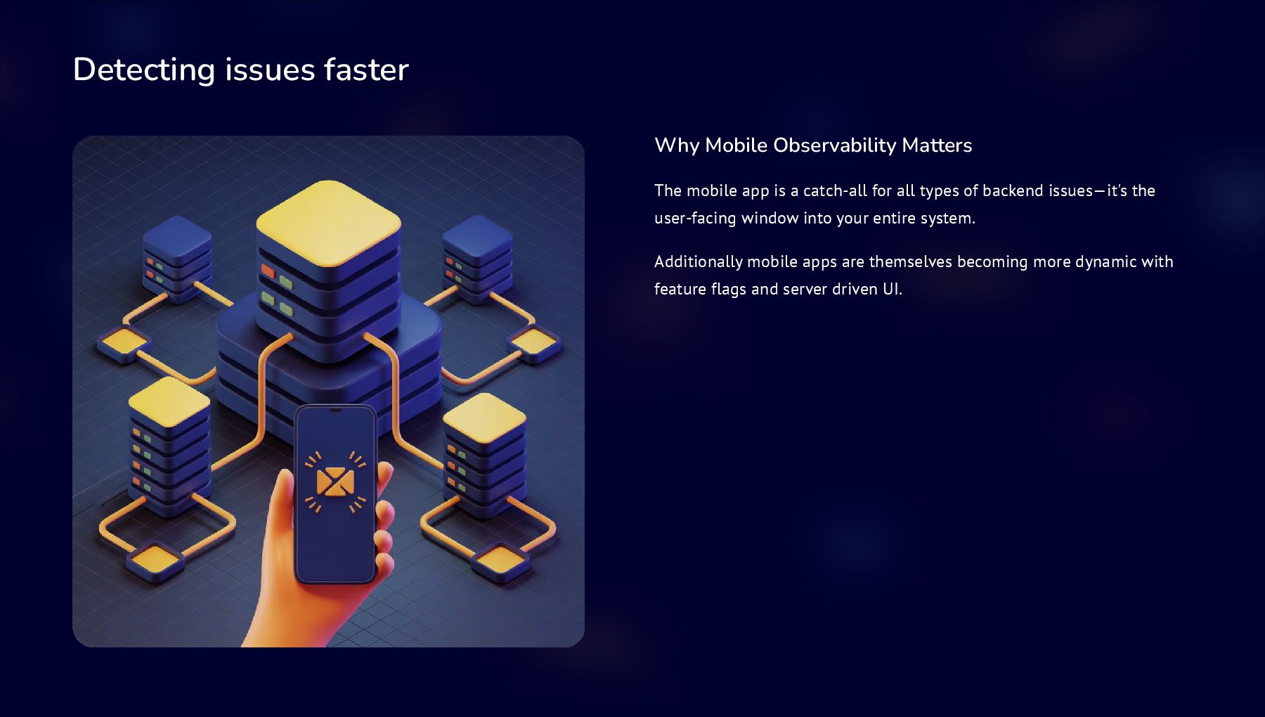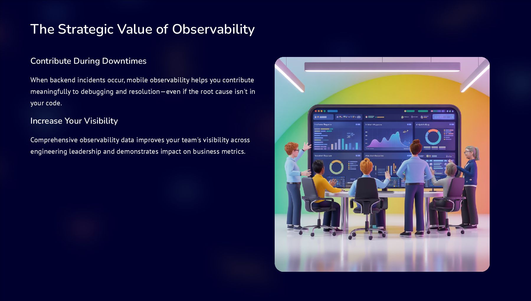 incidents occur, mobile observability helps you contribute meaningfully to debugging and resolution—even if the root cause isn't in your code. Increase Your Visibility Comprehensive observability data improves your team's visibility across engineering leadership and demonstrates impact on business metrics.