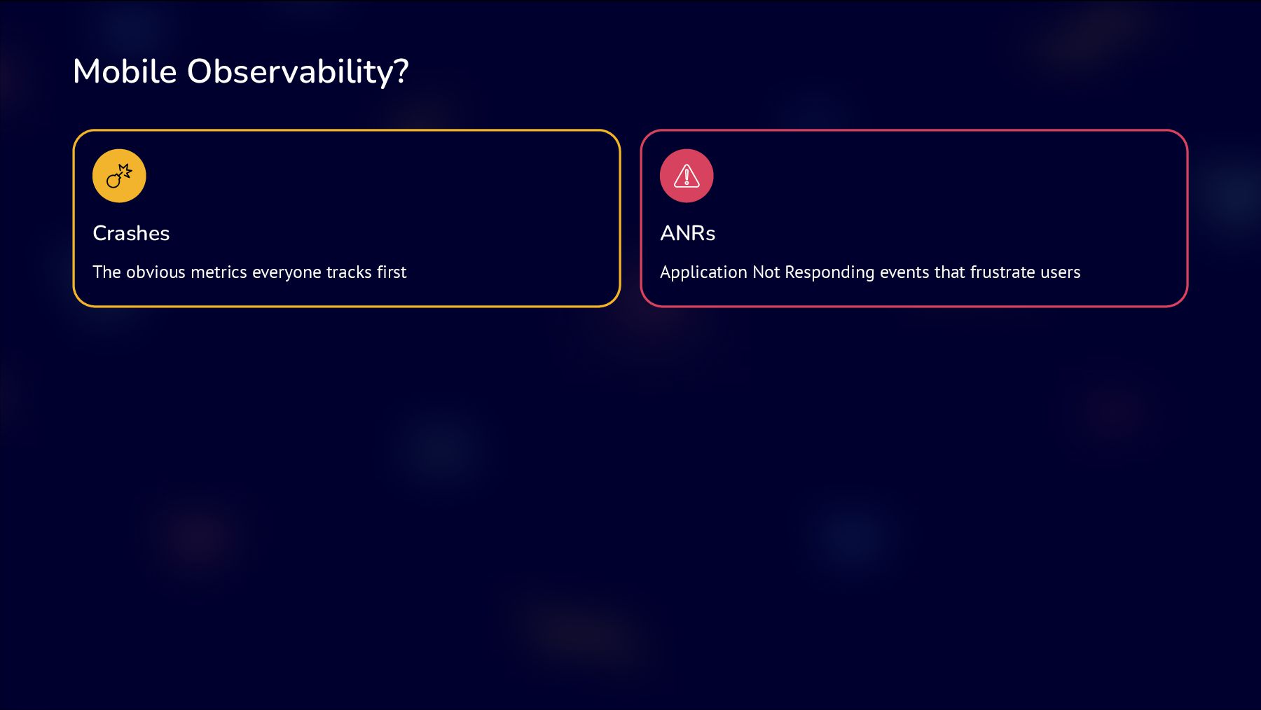 3. Mobile Observability? Crashes The obvious metrics everyone tracks first ANRs