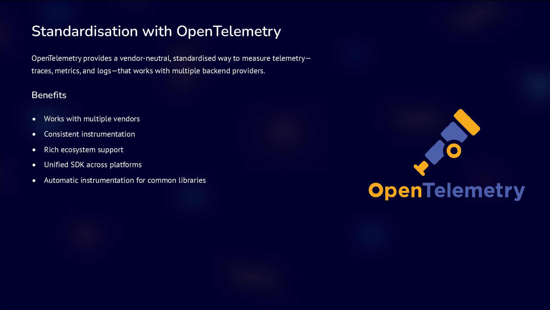 21. Standardisation with OpenTelemetry OpenTelemetry provides a vendor-neutral, standardised way to