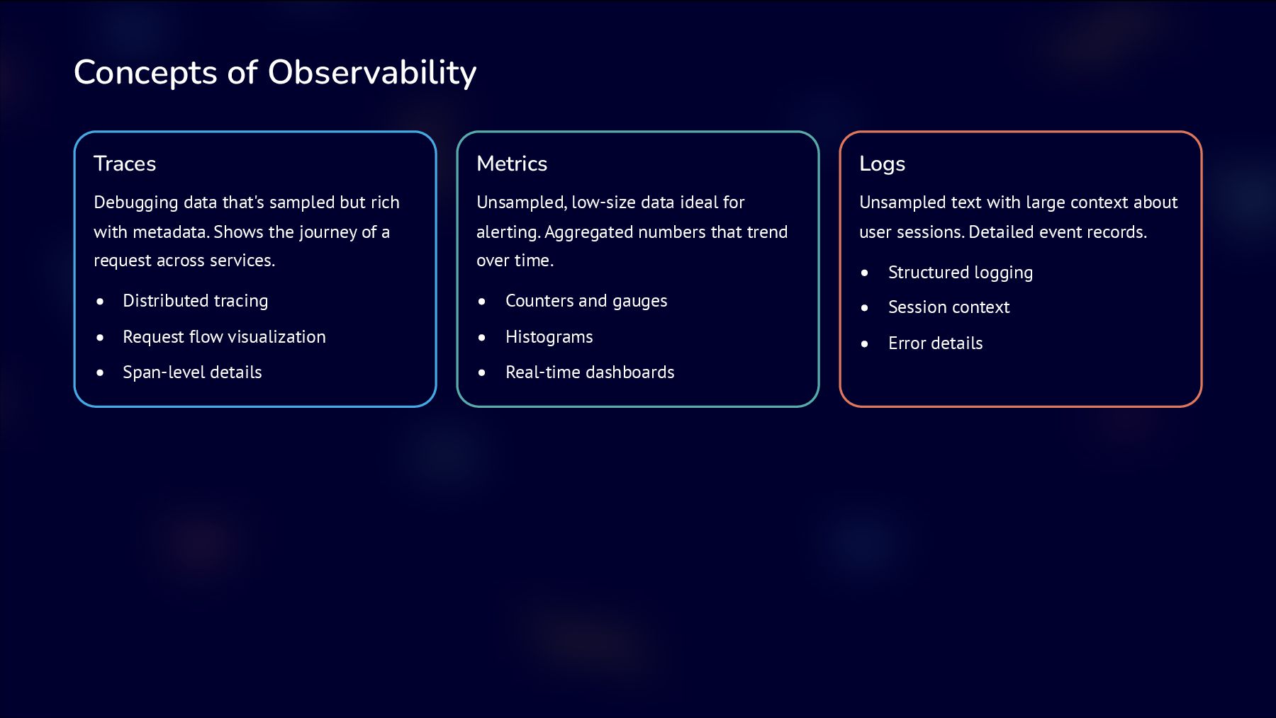 with metadata. Shows the journey of a request across services. Distributed tracing Request flow visualization Span-level details Metrics Unsampled, low-size data ideal for alerting. Aggregated numbers that trend over time. Counters and gauges Histograms Real-time dashboards Logs Unsampled text with large context about user sessions. Detailed event records. Structured logging Session context Error details