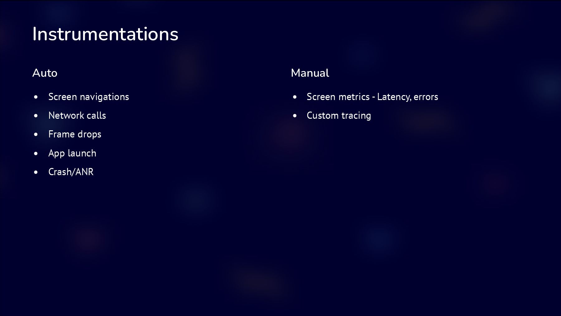 Crash/ANR Manual Screen metrics - Latency, errors Custom tracing