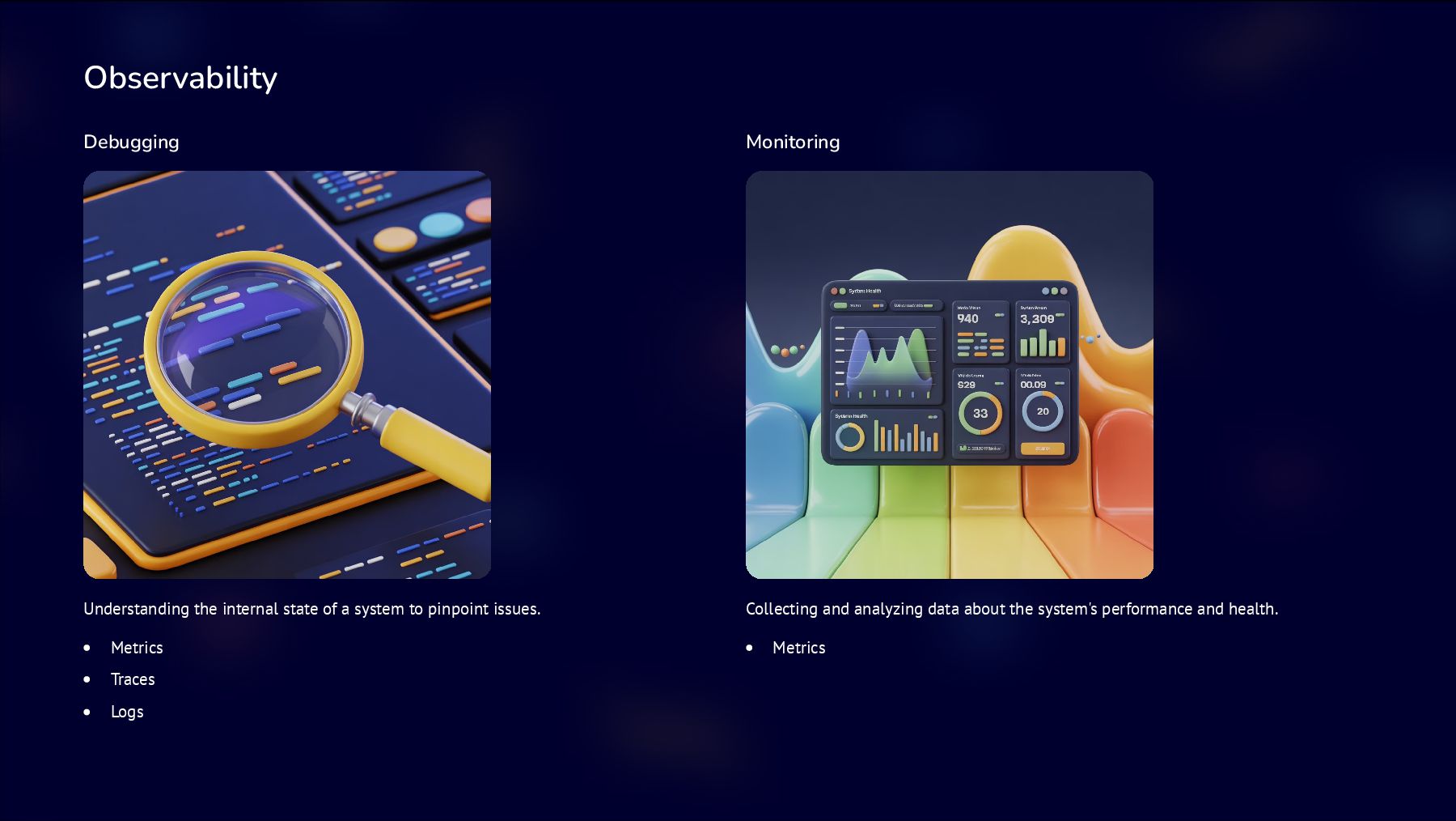pinpoint issues. Metrics Traces Logs Monitoring Collecting and analyzing data about the system's performance and health. Metrics