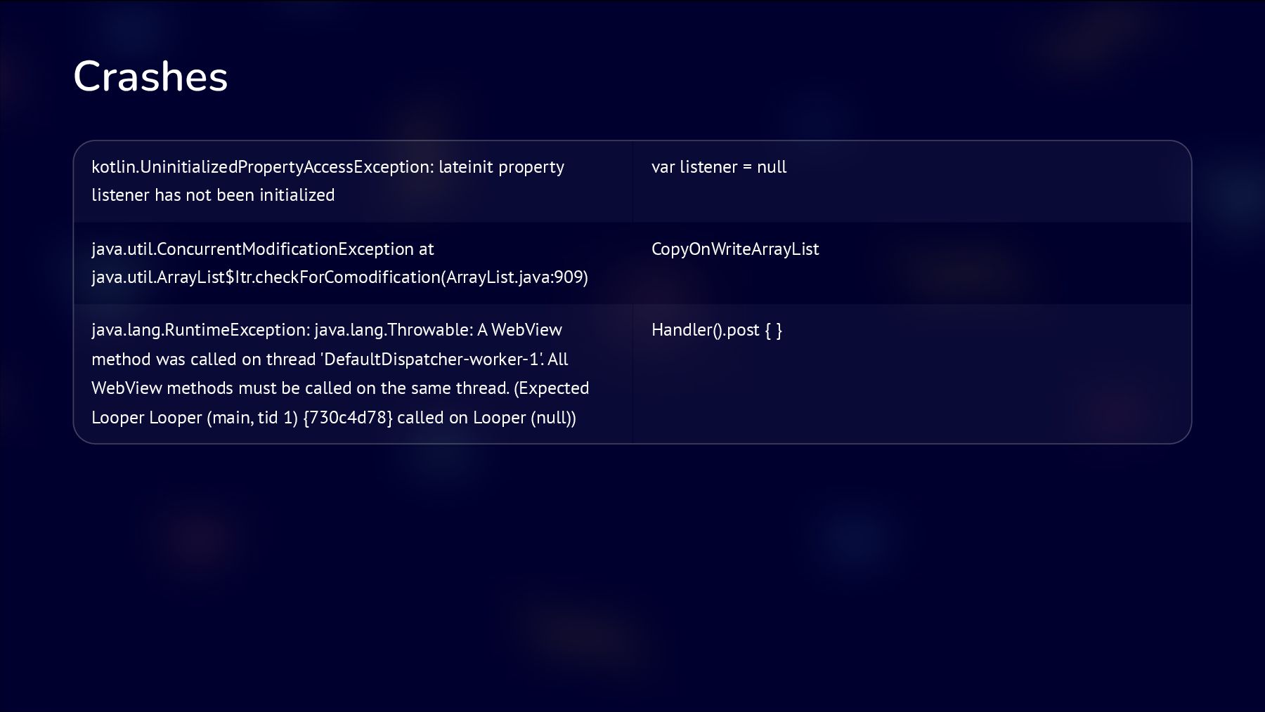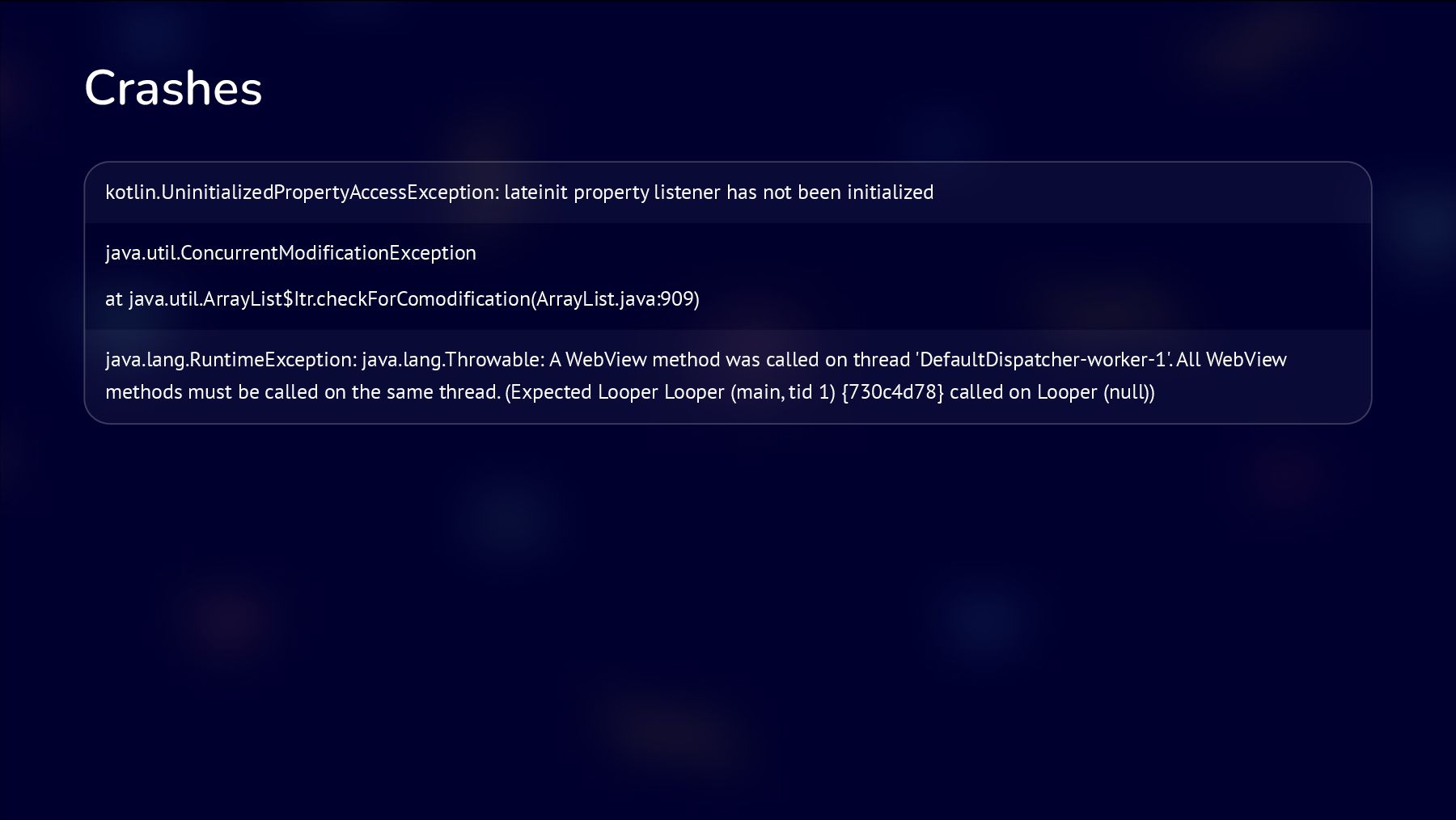 listener = null java.util.ConcurrentModificationException at java.util.ArrayList$Itr.checkForComodification(ArrayList.java:909) CopyOnWriteArrayList java.lang.RuntimeException: java.lang.Throwable: A WebView method was called on thread 'DefaultDispatcher-worker-1'. All WebView methods must be called on the same thread. (Expected Looper Looper (main, tid 1) {730c4d78} called on Looper (null)) Handler().post { }