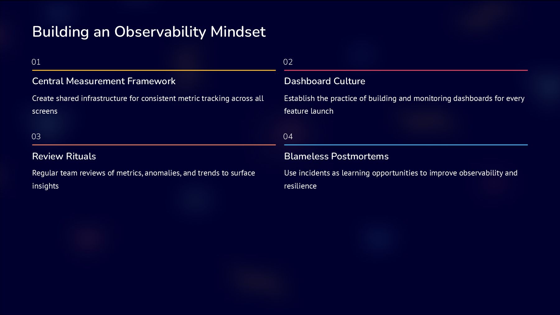 infrastructure for consistent metric tracking across all screens 02 Dashboard Culture Establish the practice of building and monitoring dashboards for every feature launch 03 Review Rituals Regular team reviews of metrics, anomalies, and trends to surface insights 04 Blameless Postmortems Use incidents as learning opportunities to improve observability and resilience
