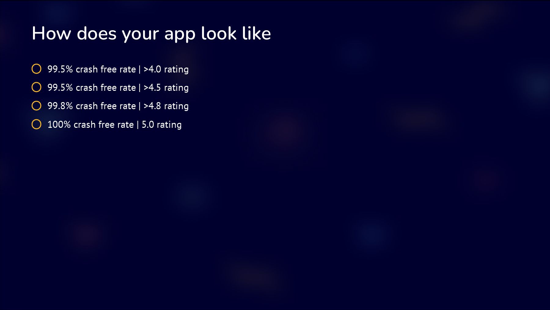 | >4.0 rating 99.5% crash free rate | >4.5 rating 99.8% crash free rate | >4.8 rating 100% crash free rate | 5.0 rating