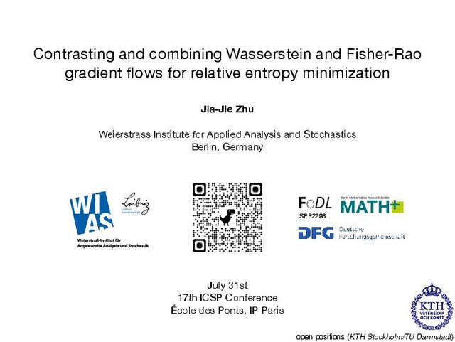 If DKL(ω(s)|ε→) → 0 for t → ↑, then h(t) → 0 and z(t) → z→. Setting H0 = D KL (ω(0)|ε→) and ϑ = ϑcLSI-P, we now deliver the convergence of the shape ω(t) to the target shape ε→ and the mass z(t) to the target mass z→. Proposition 5.7 (Shape and mass convergence) The normalized probability measure ω(t) = 1 z(t) µ(t) (the shape) converges to the target ε→ exponentially in KL divergence along the HK gradient flow, i.e., DKL(ω(t)|ε→) ↓ e↑εtH0. (shape convergence) The mass variable z(t) converges to the target mass z→ exponentially, i.e., |z(t) ↔ z→| ↓ max{z0, z→} log z0 z→ e↑ωt + H0 e↑εt ↔ e↑ωt ϖ ↔ ϑ . (mass convergence) Note that the convergence rate of the shape ω(t) to the limiting shape ε→ is dominated by the transport part alone, with an exponential decay rate ϑ = ϑCLSI . The total mass can only be changed by the growth through the Hellinger dissipation. Hence, the decay rate is simply ϖ, but it may be delayed by e↑εt if the shape converges only slowly. Combining the results of Proposition 5.6 and Proposition 5.7, we can now provide the global exponential decay analysis for the HK-KL gradient flow in the sense of the Hellinger distance. Theorem 5.8 (Convergence to equilibrium via shape-mass analysis) The following convergence estimate in the Hellinger distance holds He(µ(t), ε) ↓ max{z1/2 0 , z1/2 → } 2 H1/2 0 + z1/2 → g z0 z→ 1/2 + 1 ϑ e↑ϑt for t > 0, (5.7) where ϱ = min ϖ, ϑ/2 and g(a) = max{log(1/a), a↔1} ↗ 0. Setting H0 = D KL (ω(0)|ε→) and ϑ = ϑcLSI-P, we now deliver the convergence of the shape ω(t) to the target shape ε→ and the mass z(t) to the target mass z→. Proposition 5.7 (Shape and mass convergence) The normalized probability measure ω(t) = 1 z(t) µ(t) (the shape) converges to the target ε→ exponentially in KL divergence along the HK gradient flow, i.e., DKL(ω(t)|ε→) ↓ e↑εtH0. (shape convergence) The mass variable z(t) converges to the target mass z→ exponentially, i.e., |z(t) ↔ z→| ↓ max{z0, z→} log z0 z→ e↑ωt + H0 e↑εt ↔ e↑ωt ϖ ↔ ϑ . (mass convergence) Note that the convergence rate of the shape ω(t) to the limiting shape ε→ is dominated by the transport part alone, with an exponential decay rate ϑ = ϑCLSI . The total mass can only be changed by the growth through the Hellinger dissipation. Hence, the decay rate is simply ϖ, but it may be delayed by e↑εt if the shape converges only slowly. Combining the results of Proposition 5.6 and Proposition 5.7, we can now provide the global exponential decay analysis for the HK-KL gradient flow in the sense of the Hellinger distance. Theorem 5.8 (Convergence to equilibrium via shape-mass analysis) The following convergence estimate in the Hellinger distance holds He(µ(t), ε) ↓ max{z1/2 0 , z1/2 → } 2 H1/2 0 + z1/2 → g z0 z→ 1/2 + 1 ϑ e↑ϑt for t > 0, (5.7) where ϱ = min ϖ, ϑ/2 and g(a) = max{log(1/a), a↔1} ↗ 0. 35 [Mielke-Z. 2025]’s results for the HK/WFR gradient fl ows of KL HK Gradient Flows for Entropy Functionals Figure 7: See Proposition 5.2 for the details of the functional inequality a Wasserstein flow of positive measures. In this plot, the density rati constant. Hence, there is no “Otto-Wasserstein gradient” to drive the c ω towards ε. When initialized at µ, the Otto-Wasserstein flow drives towards ω. Proposition 5.3 (Generalized log-Sobolev inequality on M+) Suppose th mic Sobolev inequality (LSI) holds with a positive constant cLSI-P > 0 when res probability measures (i.e. µ and ε are probability measures). Then, the following holds for the Otto-Wasserstein gradient flow over the positive measures M+: → log dµ dε 2 dµ ↑ cLSI-P · D KL (µ|ε) ↓ (z log z ↓ z + 1) , ( where z := µ(!) is the total mass of the measure µ. Moreover, we have → log dµ dε 2 dµ ↑ cLSI-P · D KL (µ|z · ε) . The intuition here is that the Otto-Wasserstein gradient flow, viewed as a mass-p flow with total mass µ(!), satisfies the LSI type inequality. This is illustrated in Proof of Proposition 5.3. We have the logarithmic Sobolev inequality (LS probability measures ˜ µ := 1 z · µ where z := µ(!) is the mass of µ, d˜ µ dε → log d˜ µ dε 2 dε ↑ cLSI-P · D KL (˜ µ|ε). 31 HK Gradient Flows for Entropy Functionals In the following result, we can see two contributions to the convergence of µ(t) = z(t)ω(t) to ε = z→ε→, where z→ := ε(!) is the total mass of the target measure and ε→ is a probability measure, a.k.a. the shape. We now detail the results of the shape-mass analysis for the HK-KL gradient flow. We first provide the convergence of the mass variable z(t) to the target mass z→. Proposition 5.6 (Solution of the mass equation) The equation of mass (Mass-HK) admits the explicit solution z(t) = z→ z0 z→ e →ωt e↑h(t). (5.6) where h(t) = t 0 e↑ω(t↑s)DKL(ω(s)|ε→)ds is an auxiliary function. If DKL(ω(s)|ε→) → 0 for t → ↑, then h(t) → 0 and z(t) → z→. Setting H0 = D KL (ω(0)|ε→) and ϑ = ϑcLSI-P, we now deliver the convergence of the shape ω(t) to the target shape ε→ and the mass z(t) to the target mass z→. Proposition 5.7 (Shape and mass convergence) The normalized probability measure ω(t) = 1 z(t) µ(t) (the shape) converges to the target ε→ exponentially in KL divergence along the HK gradient flow, i.e., DKL(ω(t)|ε→) ↓ e↑εtH0. (shape convergence) The mass variable z(t) converges to the target mass z→ exponentially, i.e., |z(t) ↔ z→| ↓ max{z0, z→} log z0 z→ e↑ωt + H0 e↑εt ↔ e↑ωt ϖ ↔ ϑ . (mass convergence) Note that the convergence rate of the shape ω(t) to the limiting shape ε→ is dominated by the transport part alone, with an exponential decay rate ϑ = ϑCLSI . The total mass can only be changed by the growth through the Hellinger dissipation. Hence, the decay rate is simply ϖ, but it may be delayed by e↑εt if th