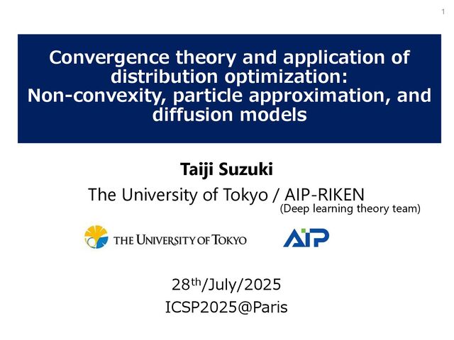 Sakaguchi, Suzuki: Propagation of Chaos for Mean-Field Langevin Dynamics and its Application to Model Ensemble. ICML2025. • [Optimization of a probability measure on a strict saddle objecive] - Kim, Suzuki: Transformers Learn Nonlinear Features In Context: Nonconvex Mean-field Dynamics on the Attention Landscape. ICML2024, oral. - Yamamto, Kim, Suzuki: Hessian-guided Perturbed Wasserstein Gradient Flows for Escaping Saddle Points. 2025. Part 2: Non-convex (strict-saddle objective) 1. Gaussian process perturbation: A polynomial time method to avoid a saddle point by a “random perturbation” of a probability measure. 2. In-context learning: The objective to train a two-layer transformer is strict-saddle. Mean-field Langevin dynamics (𝐹 𝜇 + 𝜆Ent(𝜇)) • Optimization of probability measures by WG-flow • Particle approximation • Defective log-Sobolev inequality Part 1: Convex (propagation of chaos)
