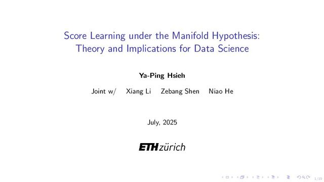 σ (x) = log M 1 (2πσ2)d/2 exp − ∥x − Φ(u, 0)∥2 2σ2 pdata(u)du ⇓ Approximately = − 1 2σ2 ∥x − Φ(u0 , 0)∥2 + log pdata(u0 ) − log ˆ H(u0 , x) − d − n 2 log 2πσ2 + o(1) how bad we learn the score o(1) o σ−2 recover pdata arbitrary distribution support no longer on the manifold