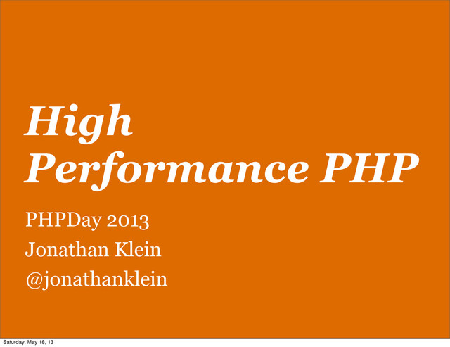 Focus on big wins • Run the latest (stable) version of PHP • Make sure you are using APC correctly • It’s always the database (stay in this room) • Caching is your friend • Know what system resources you depend on Saturday, May 18, 13