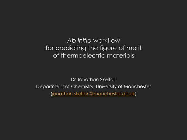 (2021) We first define the spectral conductivity tensor: Σ&' 𝜖, 𝑇 = 1 8𝜋( 6 ) 7 𝑣𝒌),& 𝑣𝒌),' 𝜏𝒌) 𝑇 𝛿 𝜖 − 𝜖𝒌) 𝑑𝒌 This is used to calculate the 𝑛th-order moments of the generalised transport coefficients: ℒ&' , 𝜖- , 𝑇 = 7 Σ&' 𝜖, 𝑇 𝜖 − 𝜖- , − 𝜕𝑓 𝜖, 𝜖- , 𝑇 𝜕𝜖 𝜕𝜖 𝑓 𝜖, 𝜖- , 𝑇 = 1 exp ⁄ 𝜖 − 𝜖- 𝑘. 𝑇 + 1 Where: o The 𝒗𝒌) are obtained from a high-quality band structure o The 𝜏𝒌) can be: treated as a constant 𝜏/! ; approximated by model equations for different scattering processes; or calculated from the electron-phonon coupling o The 𝜖- (= 𝜇) is set by the DoS and a specified extrinsic carrier concentration 𝑛 Dr J. M. Skelton MCC Conference, 5th July 2024 | Slide 8