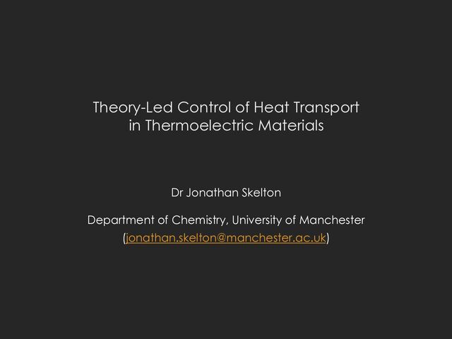 𝑇 𝑆 - Seebeck coefficient 𝜎 - electrical conductivity 𝜅"#$ - lattice thermal conductivity 𝜅!"! - electronic thermal conductivity Phonon scattering by “rattler” filler atoms Electron transport through crystalline host framework G. A. Slack in CRC Handbook of Thermoelectrics (1995) Dr Jonathan Skelton ICFM 2022, 30th May 2022 | Slide 8